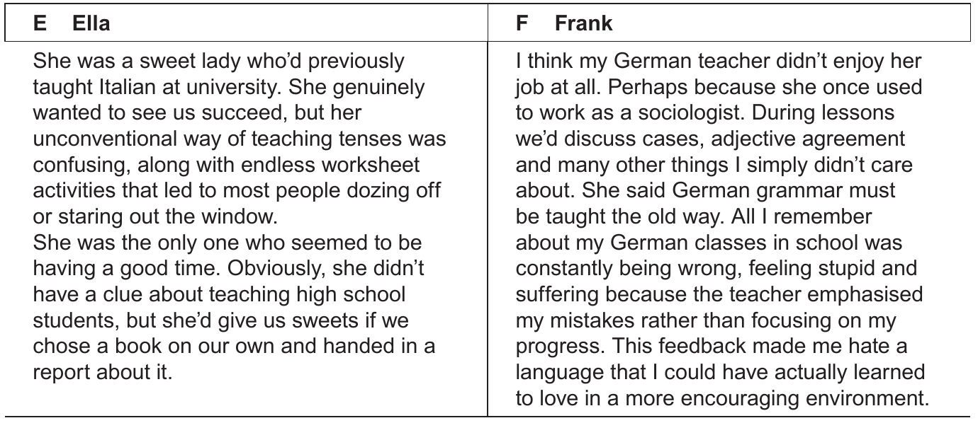 Task 1Questions 1-12You are going to read an article in which people talk about language teachers in high school.For questions 1-12, choose from the people A-F.