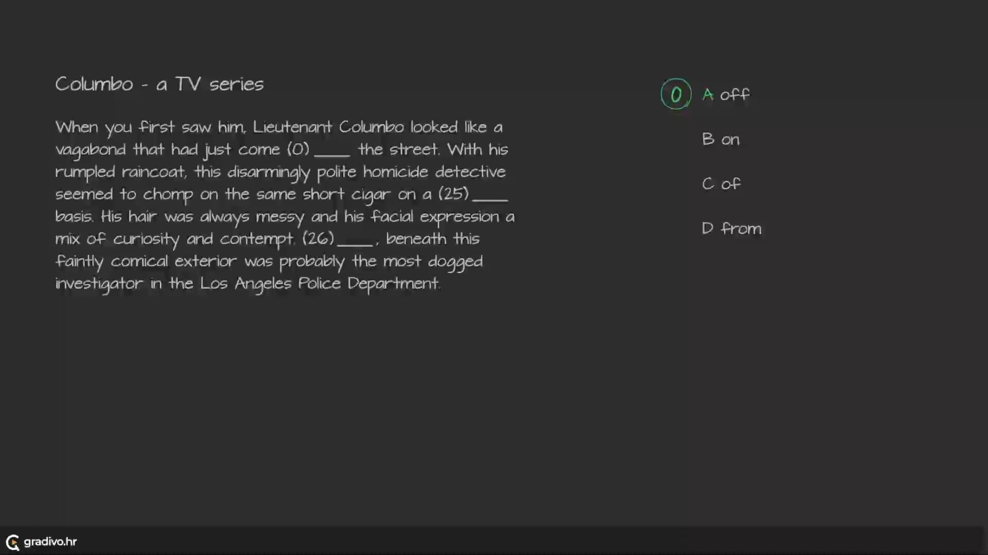 When you first saw him, Lieutenant Columbo looked like a vagabond that had just come (0) off the street.