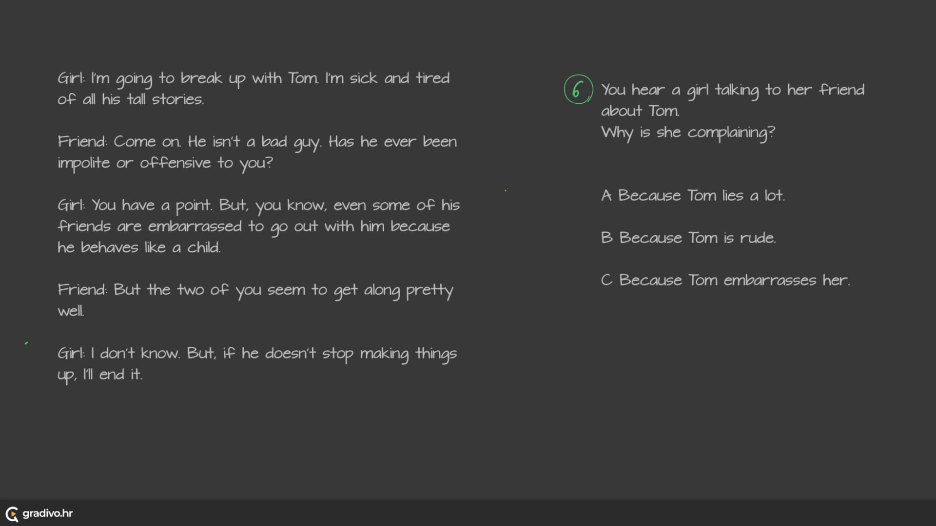 You hear a girl talking to her friend about Tom. Why is she complaining?