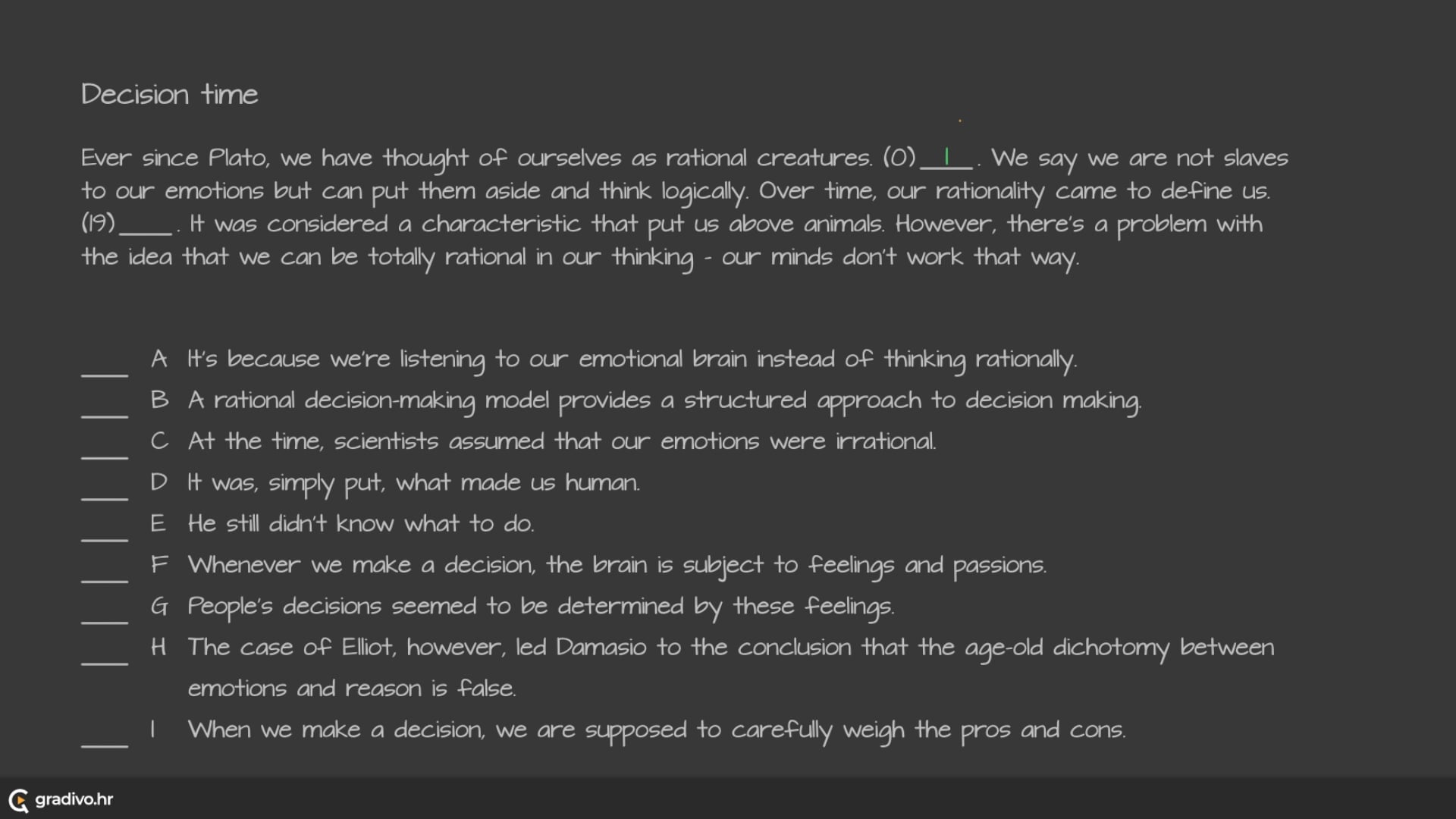 Ever since Plato, we have thought of ourselves as rational creatures. (0) When we make a decision, we are supposed to carefully weigh the pros and cons. We say we are not slaves to our emotions but can put them aside and think logically.