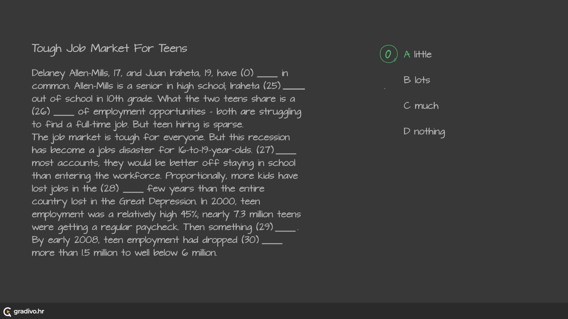The job market is tough for everyone. But this recession has become a jobs disaster for 16-to-19-year-olds. (27)