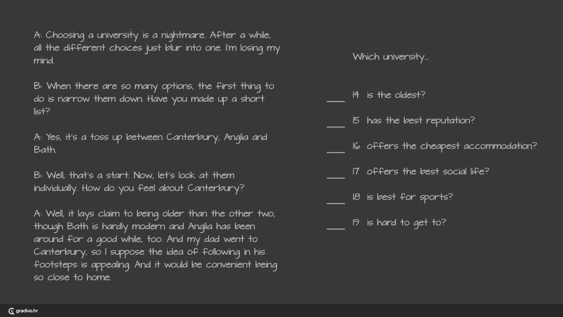 For questions 14-19, choose the correct answer (A, B or C) from the list of universities.