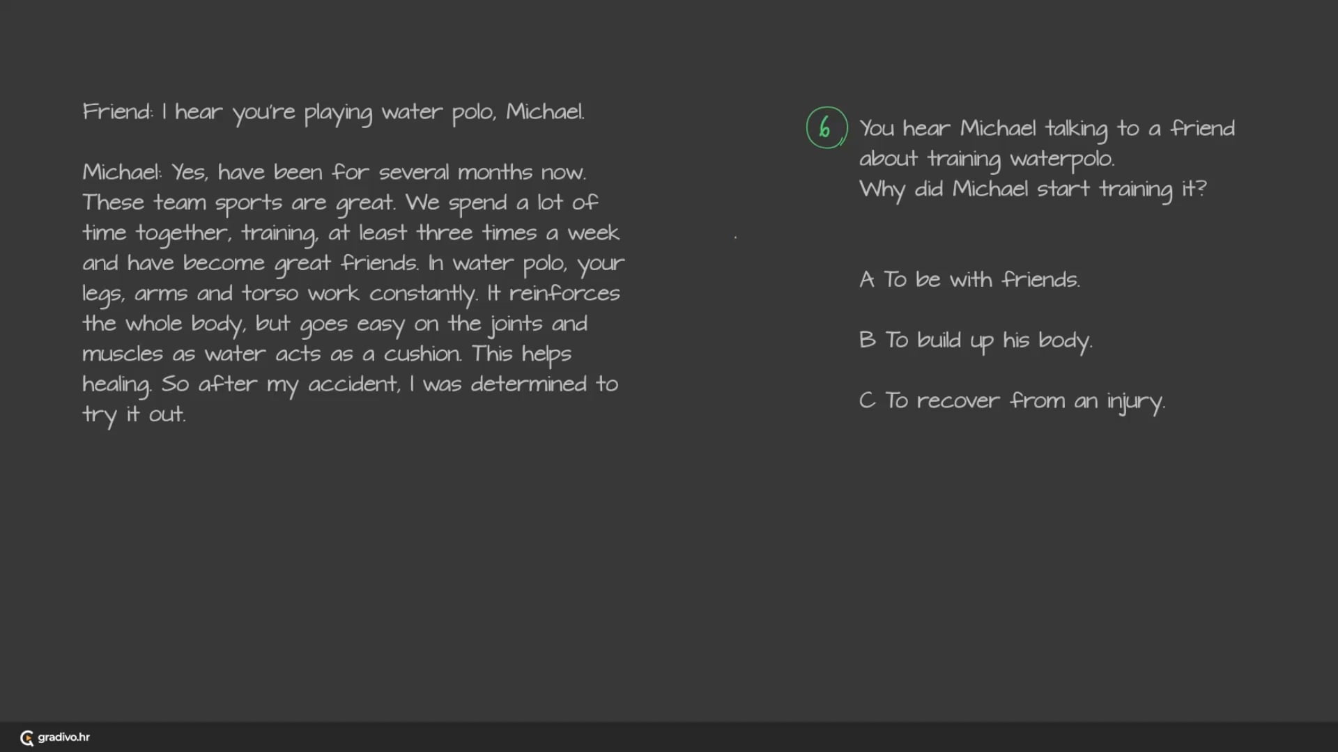 You hear Michael talking to a friend about training waterpolo. Why did Michael start training it?
