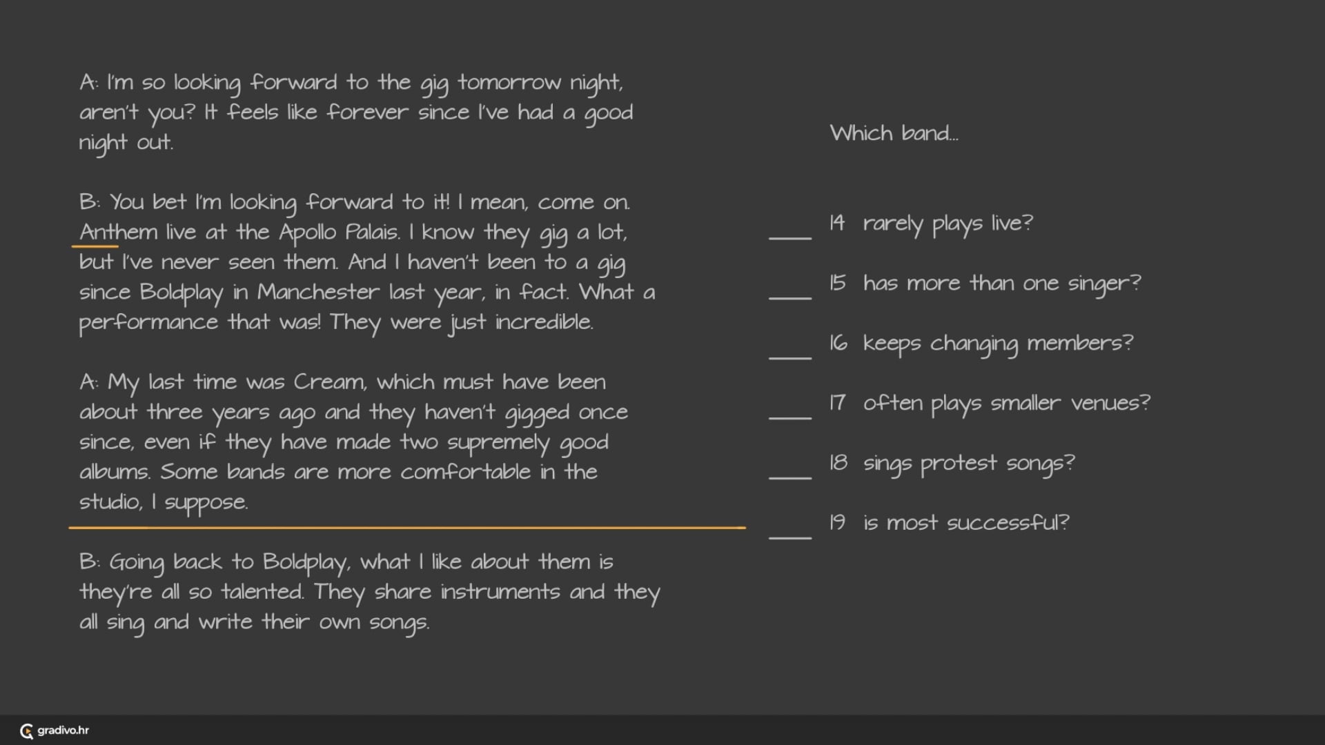 For each question (14-19), choose the correct answer (A, B or C) from the list of bands.