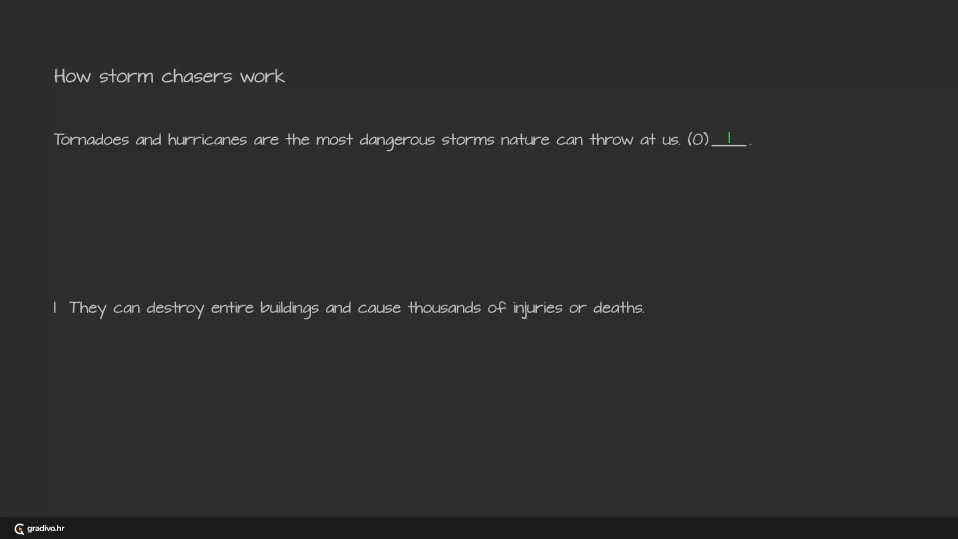 Tornadoes and hurricanes are the most dangerous storms nature can throw at us. (0) They can destroy entire buildings and cause thousands of injuries or deaths.