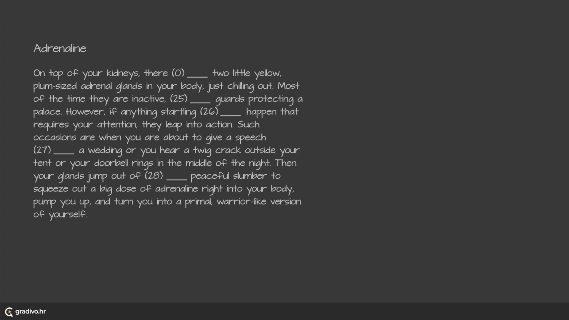 On top of your kidneys, there (0) are two little yellow, plum-sized adrenal glands in your body, just chilling out.