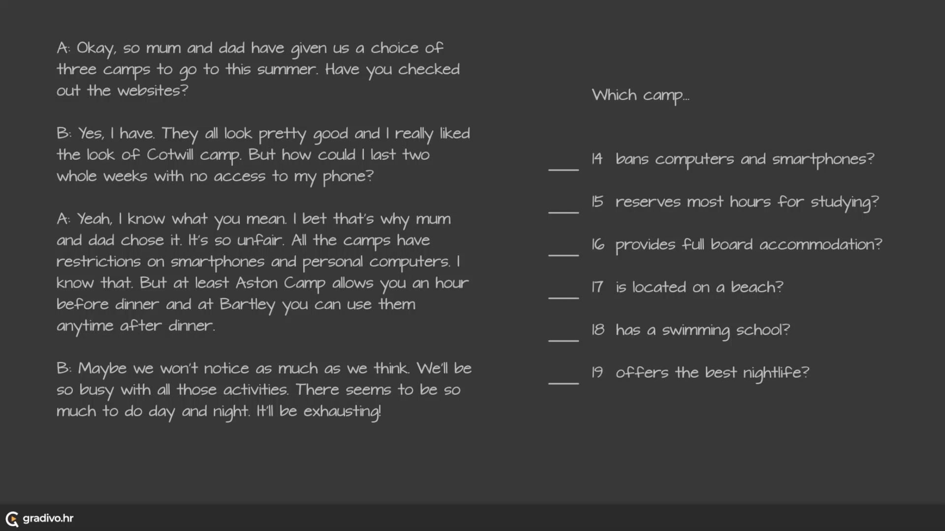 For questions 14-19, choose the correct answer (A, B or C) from the list of camps.
