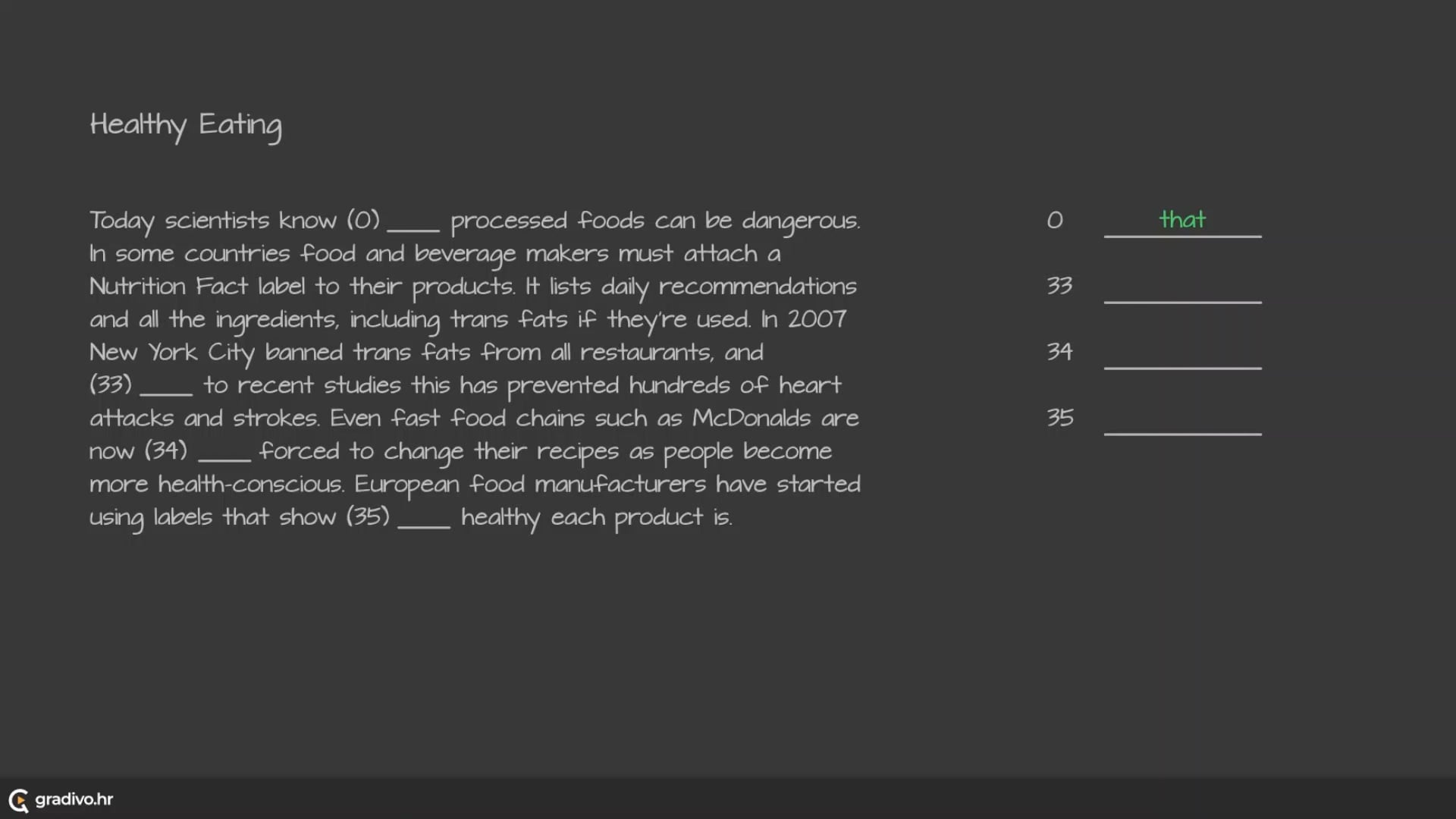Today scientists know (0) that processed foods can be dangerous. In some countries food and beverage makers must attach a Nutrition Fact label to their products.