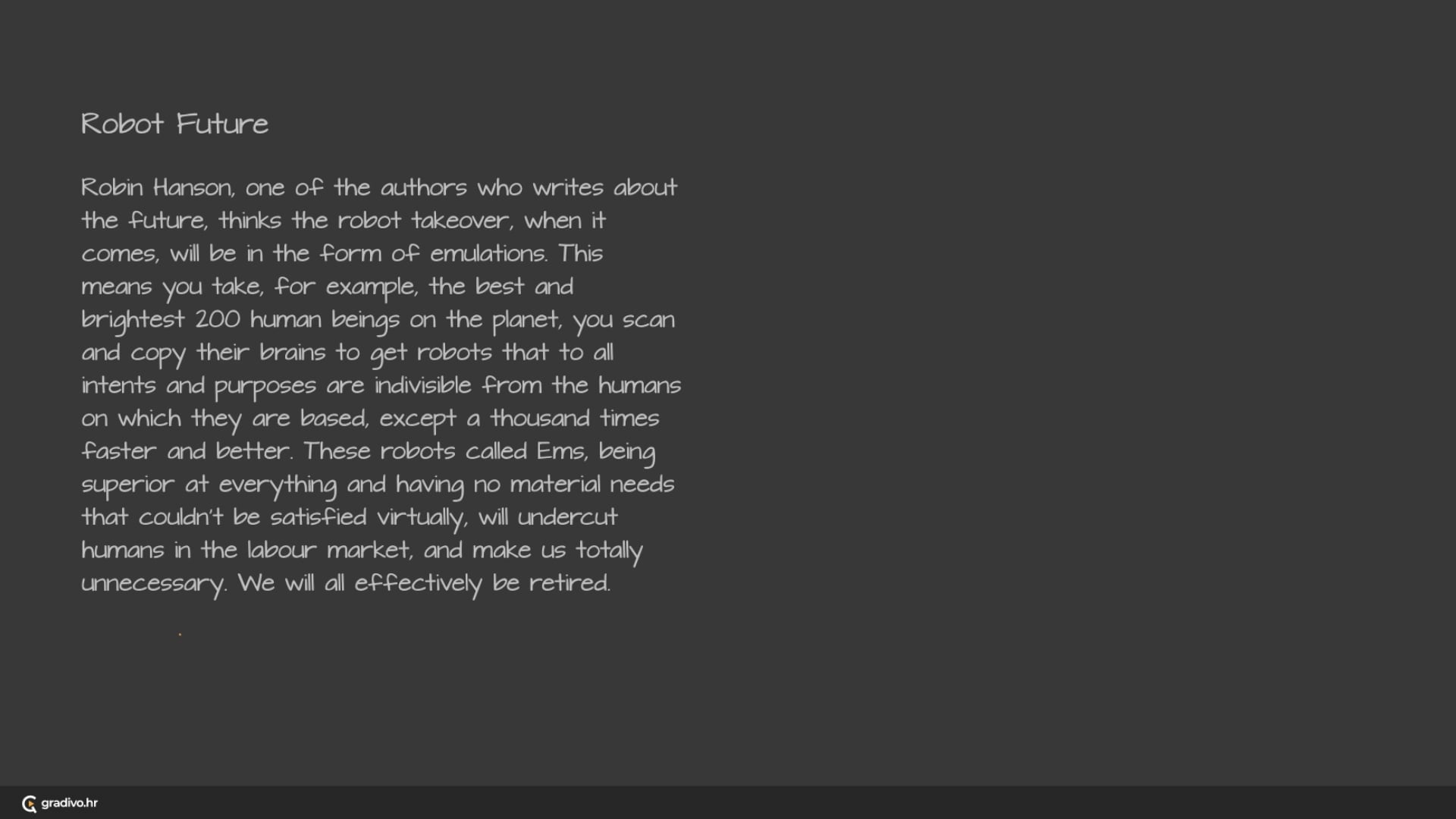 Robin Hanson, one of the authors who writes about the future, thinks the robot takeover, when it comes, will be in the form of emulations. This means you take, for example, the best and brightest 200 human beings on the planet, you scan and copy their brains to get robots that to all intents and purposes are indivisible from the humans on which they are based, except a thousand times faster and better. These robots called Ems, being superior at everything and having no material needs that couldn’t be satisfied virtually, will undercut humans in the labour market, and make us totally unnecessary. We will all effectively be retired.