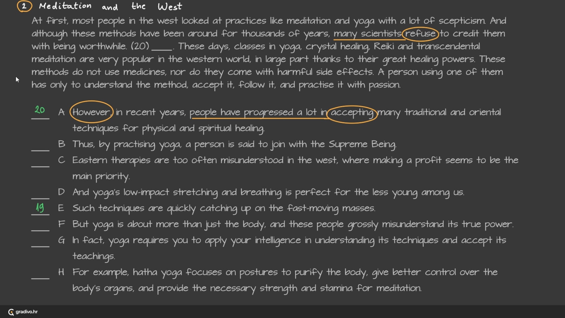 At first, most people in the west looked at practices like meditation and yoga with a lot of scepticism. And although these methods have been around for thousands of years, many scientists refuse to credit them with being worthwhile. (20)