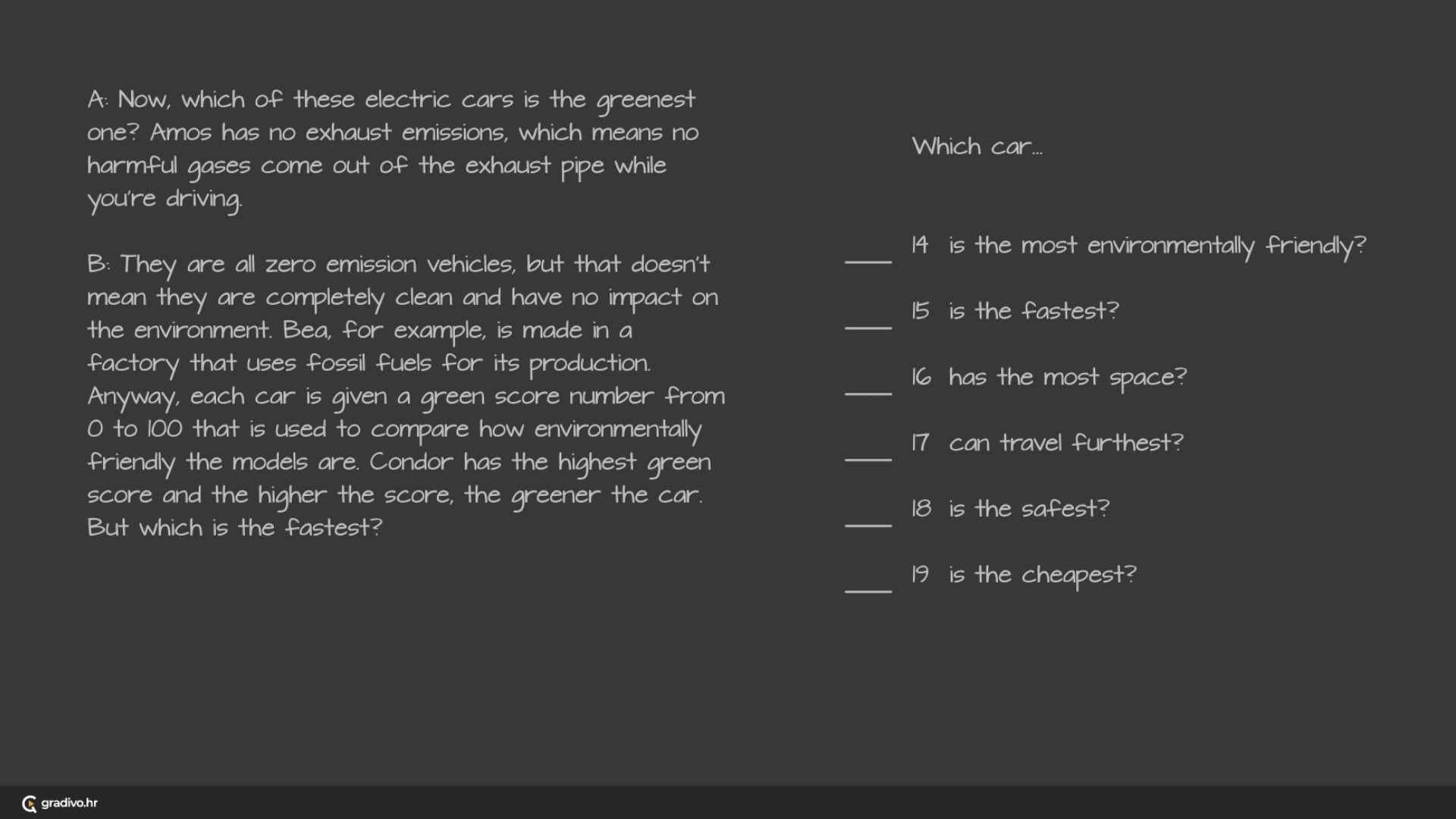 For each question (14-19), choose the correct answer (A, B or C) from the list of cars.
