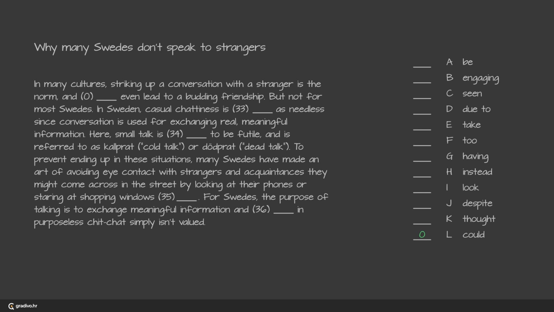 Visitors to Sweden who attempt to start an informal conversation with a shopkeeper or waiter, even with the local greeting of hej, are likely to (37)