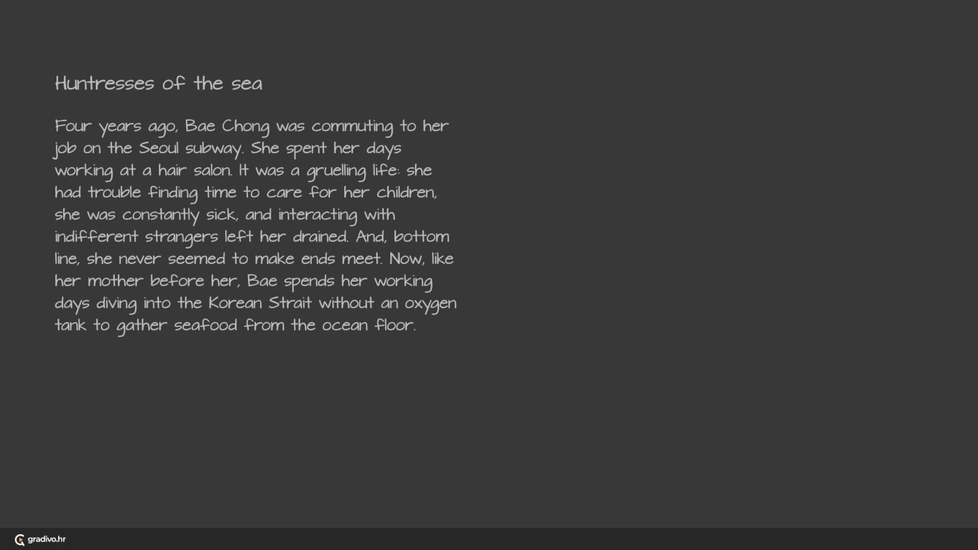 Four years ago, Bae Chong was commuting to her job on the Seoul subway. She spent her days working at a hair salon. It was a gruelling life: she had trouble finding time to care for her children, she was constantly sick, and interacting with indifferent strangers left her drained. And, bottom line, she never seemed to make ends meet. Now, like her mother before her, Bae spends her working days diving into the Korean Strait without an oxygen tank to gather seafood from the ocean floor.