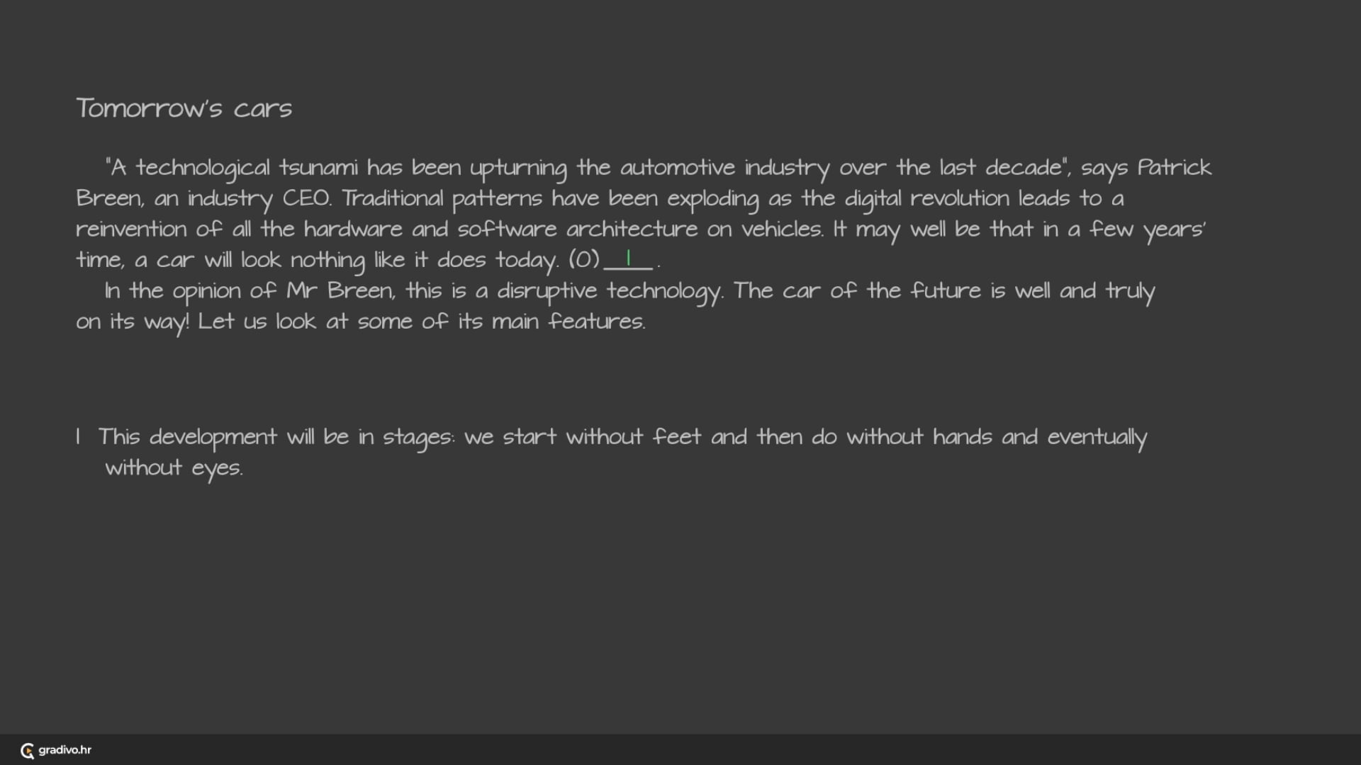 “A technological tsunami has been upturning the automotive industry over the last decade”, says Patrick Breen, an industry CEO. Traditional patterns have been exploding as the digital revolution leads to a reinvention of all the hardware and software architecture on vehicles. It may well be that in a few years’ time, a car will look nothing like it does today. (0) This development will be in stages: we start without feet and then do without hands and eventually without eyes.