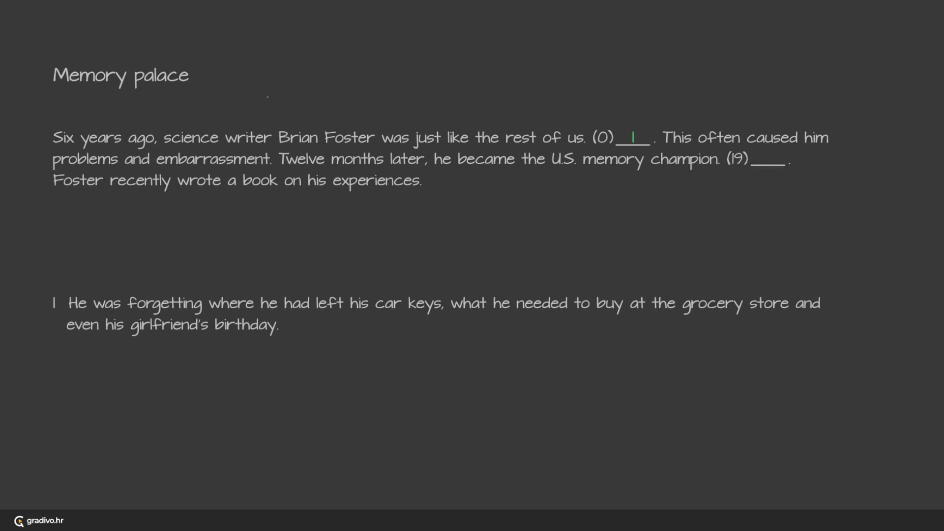 Six years ago, science writer Brian Foster was just like the rest of us. (0) He was forgetting where he had left his car keys, what he needed to buy at the grocery store and even his girlfriend’s birthday. This often caused him problems and embarrassment.
