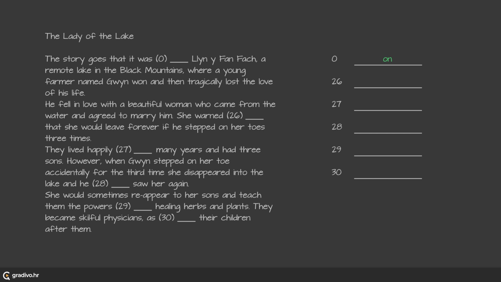 However, when Gwyn stepped on her toe accidentally for the third time she disappeared into the lake and he (28)