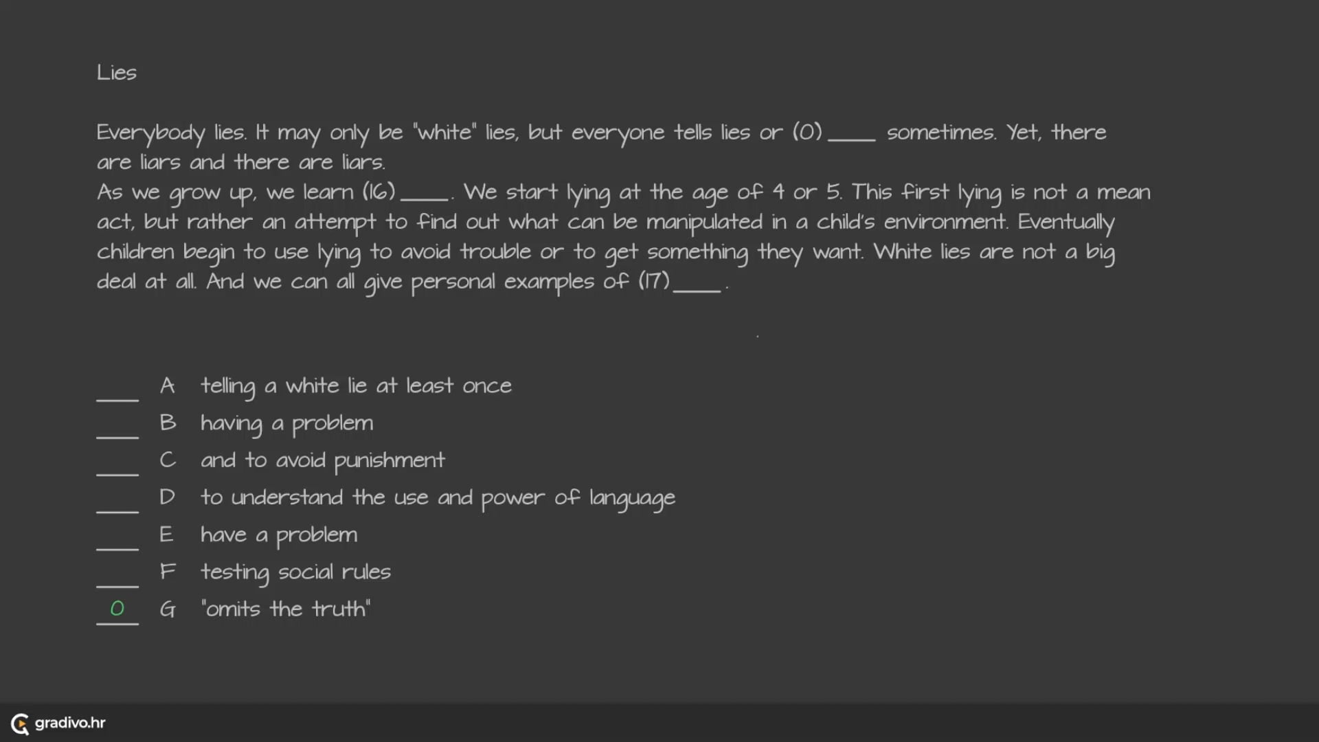 The worst group are those who lie a lot for personal benefit on purpose. These people, also known as sociopaths, often get into trouble with the law. It is very difficult to help them as they deny (20)