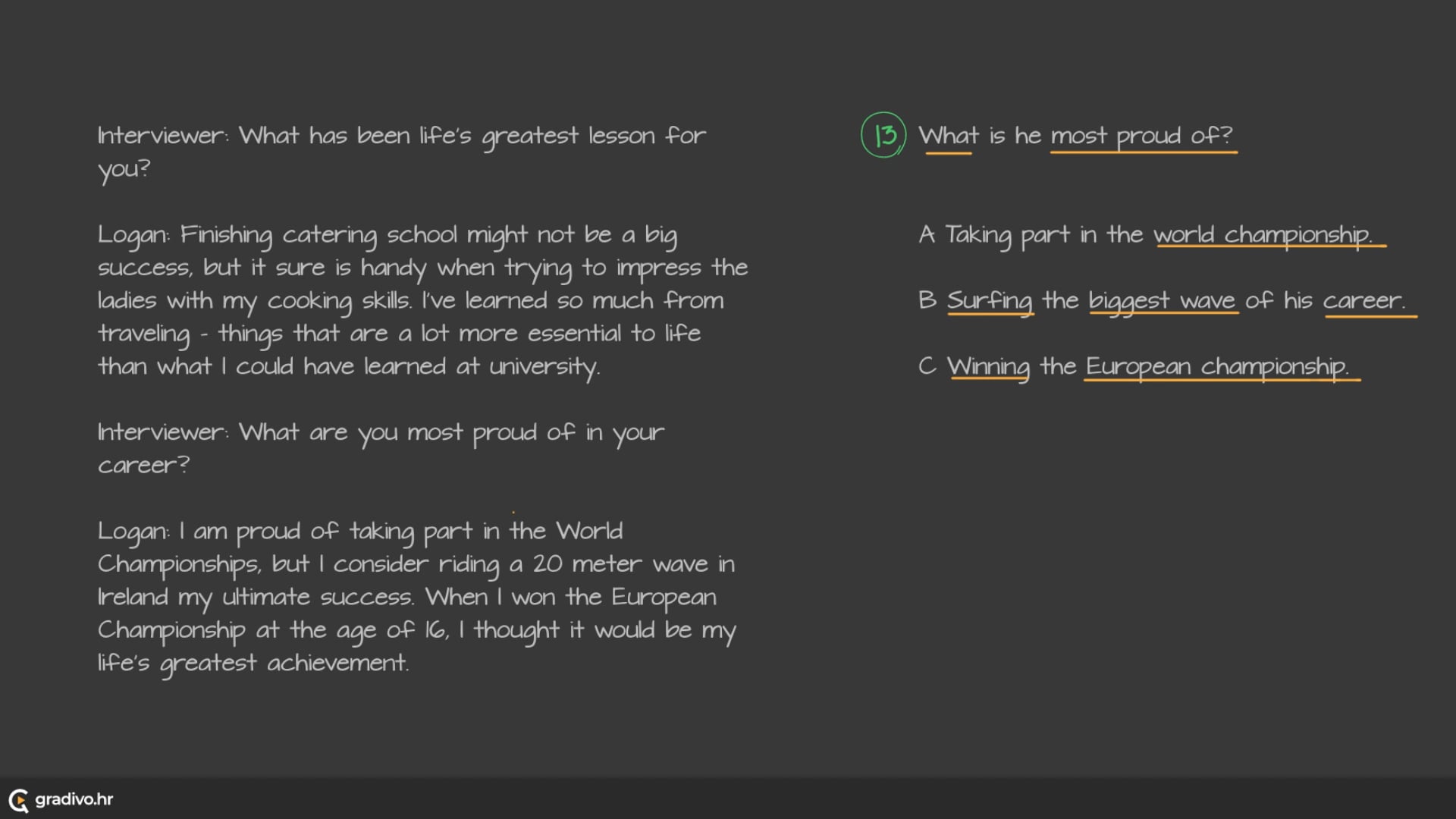 You will hear a radio interview with Logan Peterson, a wave surfer.