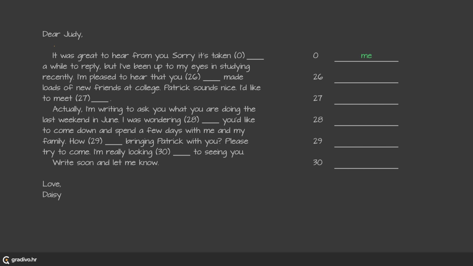 Actually, I’m writing to ask you what you are doing the last weekend in June. I was wondering (28)