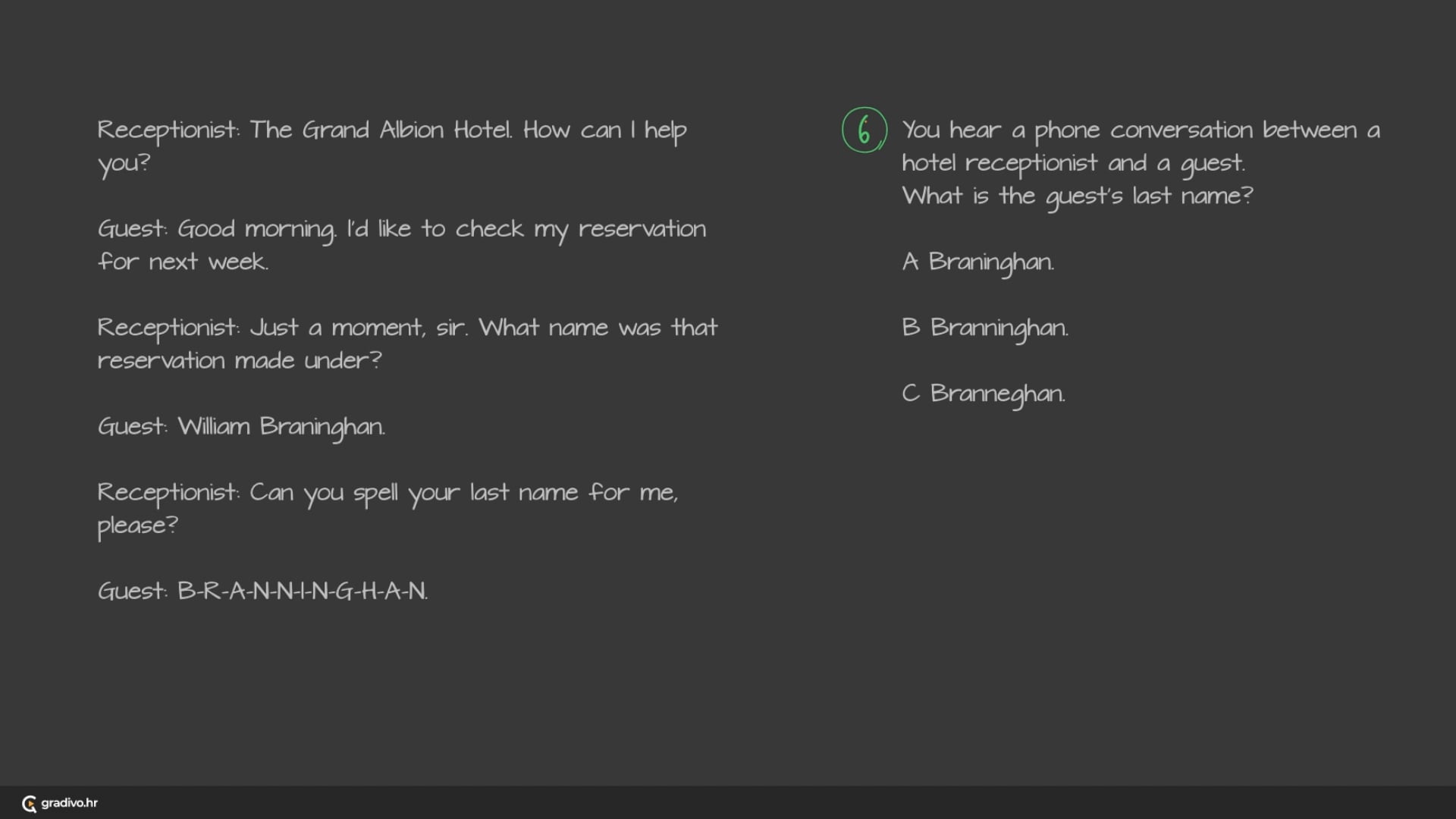 You hear a phone conversation between a hotel receptionist and a guest. What is the guest’s last name?