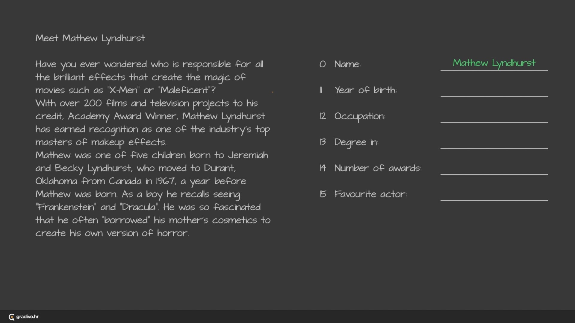 Immediately after graduation, Mathew finally arrived in Hollywood in 1989. He started his career as a set designer, but simultaneously attended classes at the academy responsible for training many of the best film and television makeup artists.