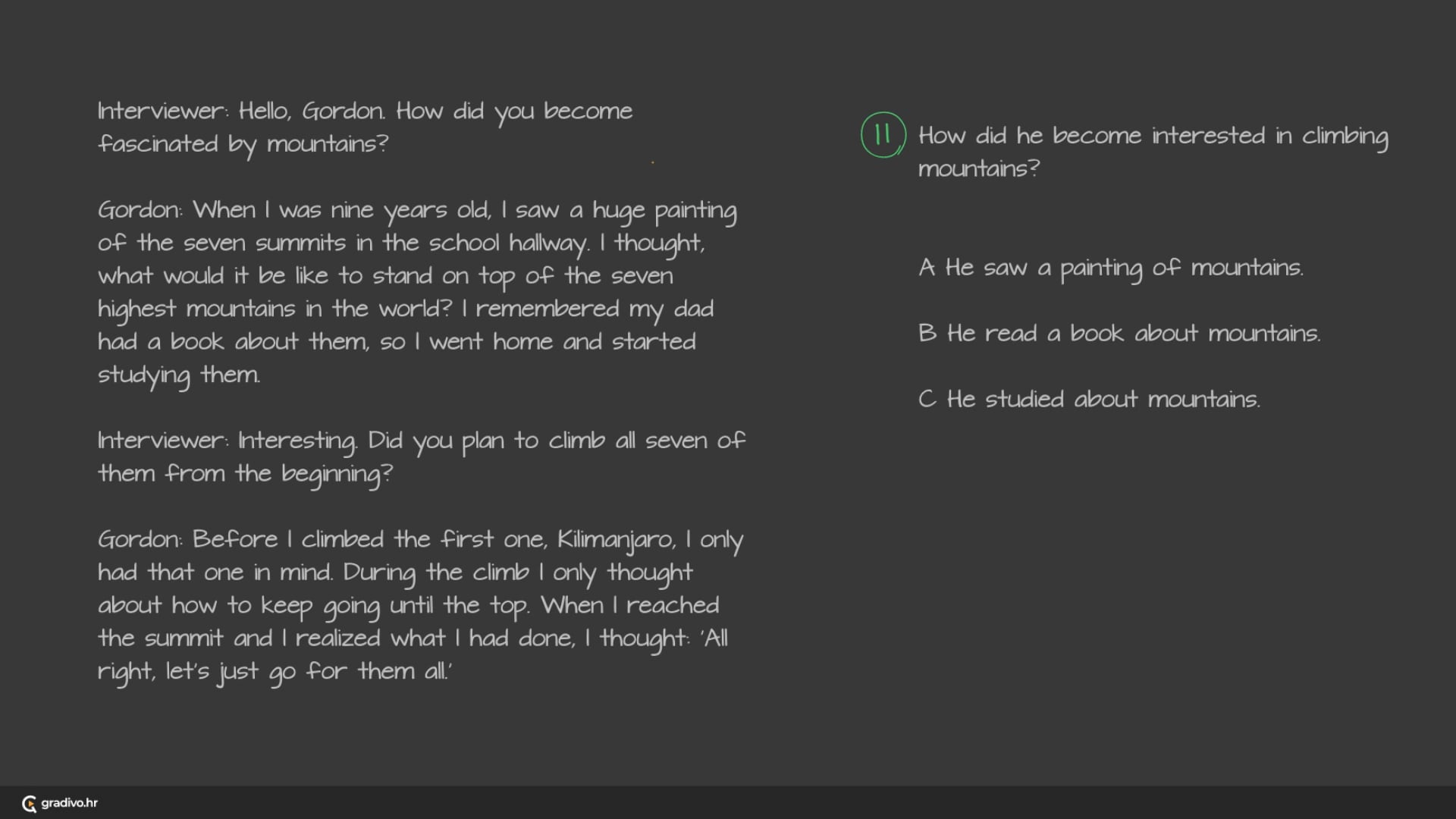 You will hear a radio interview with Gordon Ferrero about mountain-climbing.