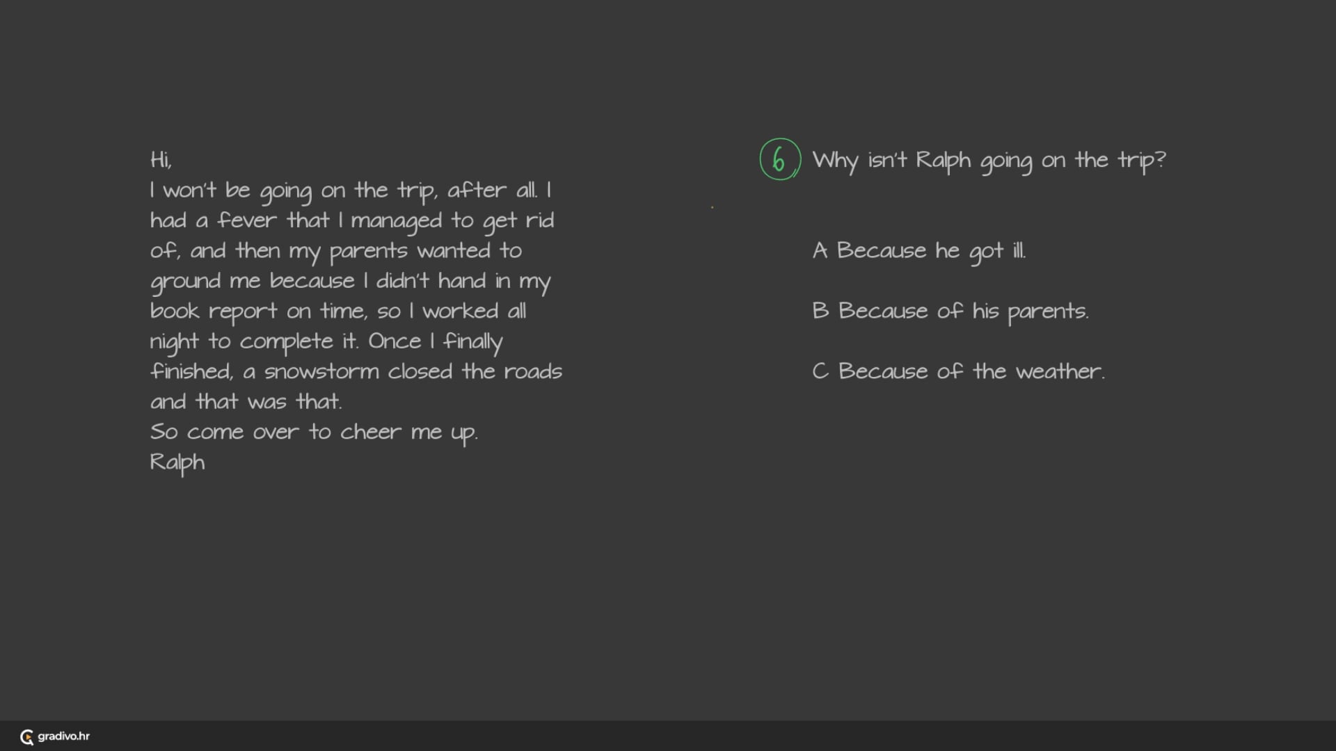 I won’t be going on the trip, after all. I had a fever that I managed to get rid of, and then my parents wanted to ground me because I didn’t hand in my book report on time, so I worked all night to complete it. Once I finally finished, a snowstorm closed the roads and that was that. So come over to cheer me up.