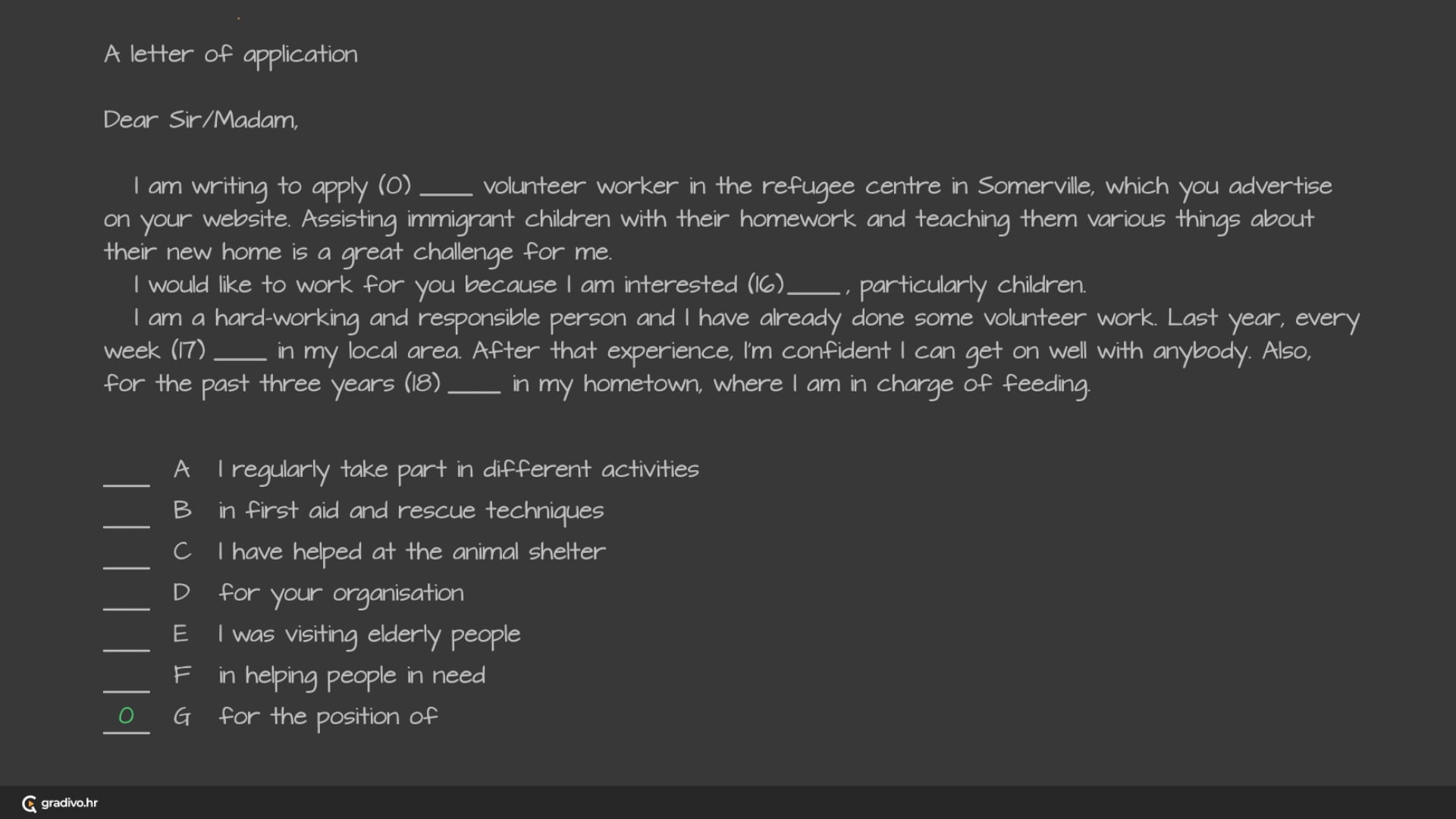 I am a hard-working and responsible person and I have already done some volunteer work. Last year, every week (17)