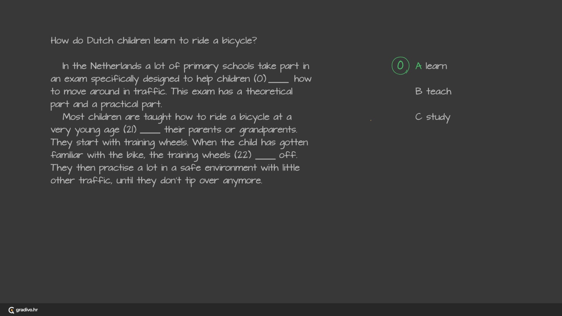 In the Netherlands a lot of primary schools take part in an exam specifically designed to help children (0) learn how to move around in traffic. This exam has a theoretical part and a practical part.