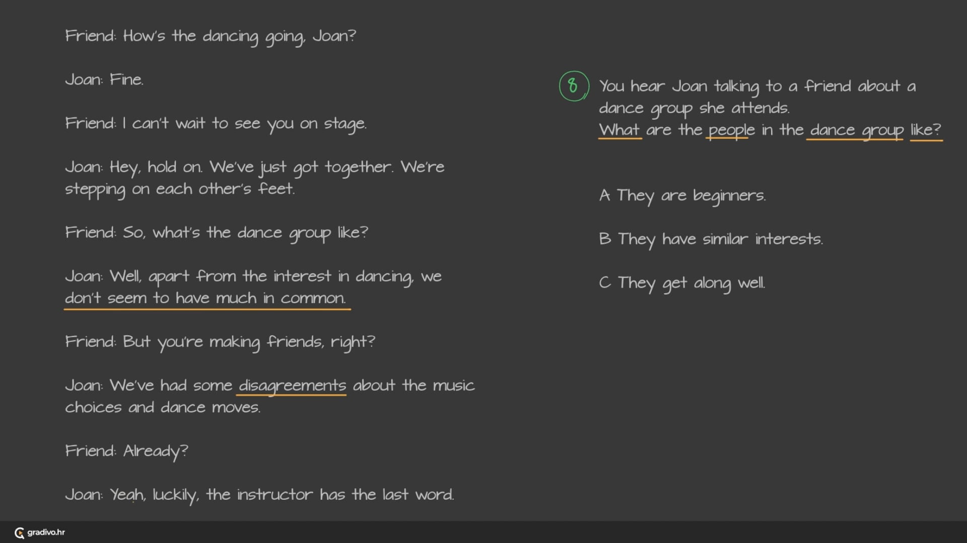 You hear Joan talking to a friend about a dance group she attends. What are the people in the dance group like?