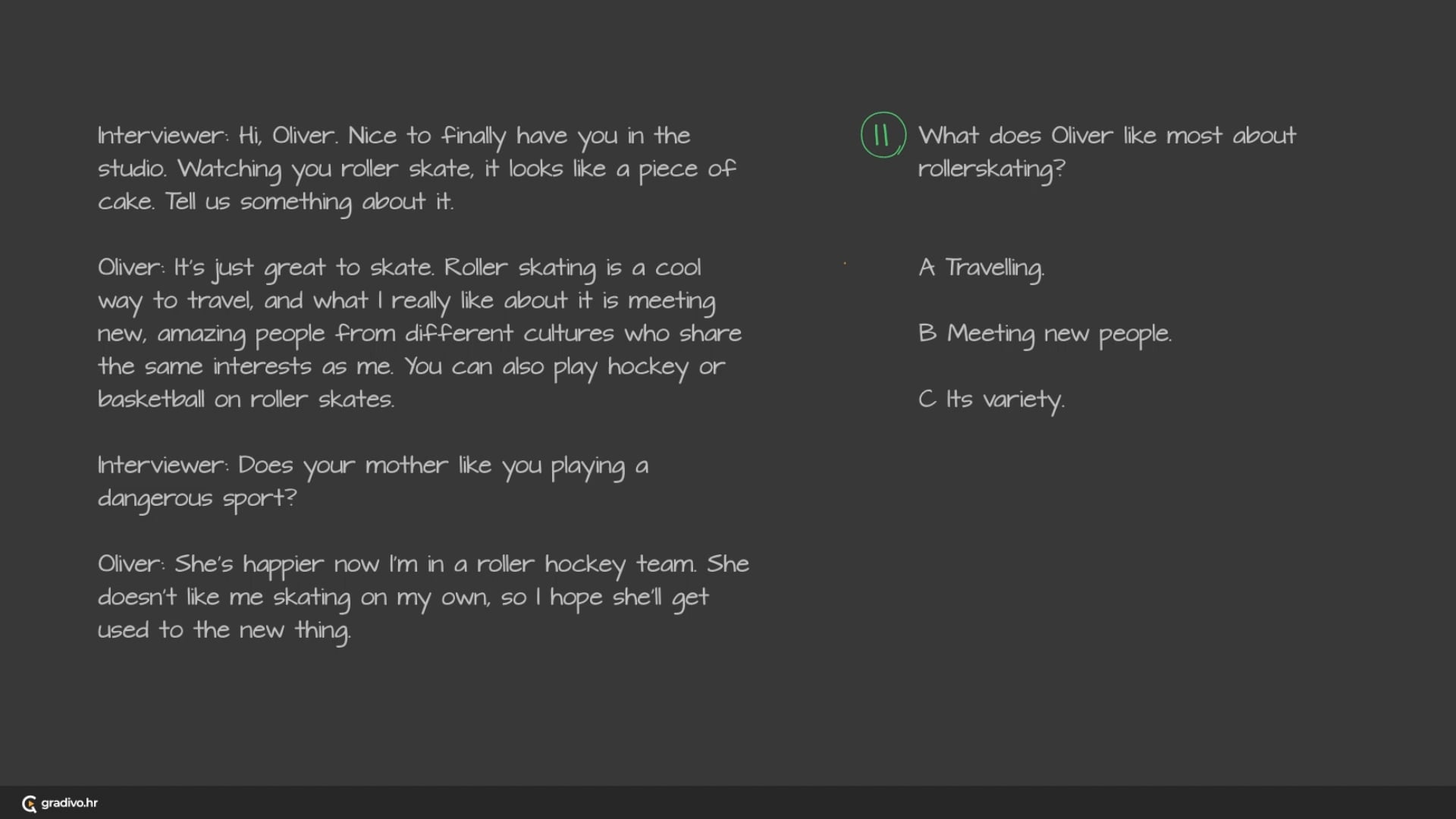 You will hear a radio interview with Oliver Lynch about his passion, rollerskating.