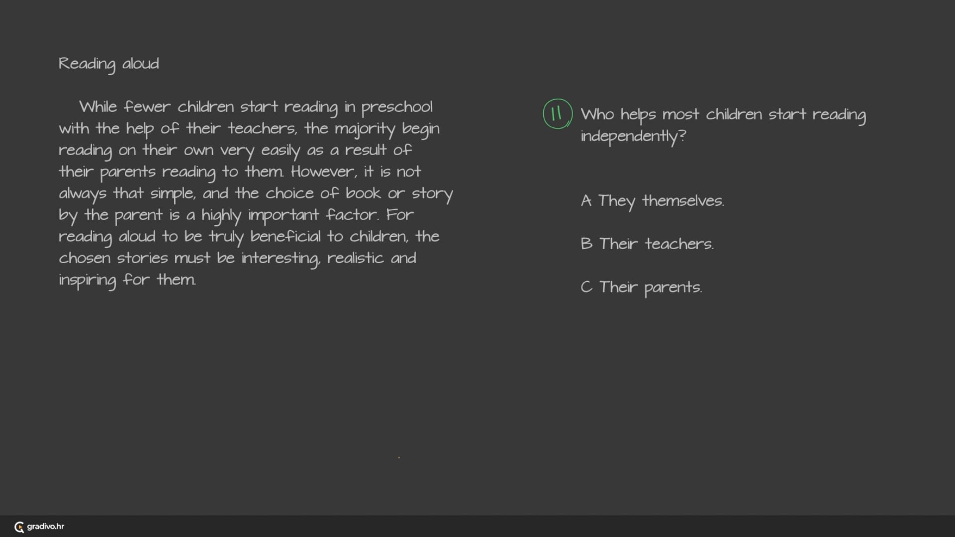 While fewer children start reading in preschool with the help of their teachers, the majority begin reading on their own very easily as a result of their parents reading to them. However, it is not always that simple, and the choice of book or story by the parent is a highly important factor. For reading aloud to be truly beneficial to children, the chosen stories must be interesting, realistic and inspiring for them.