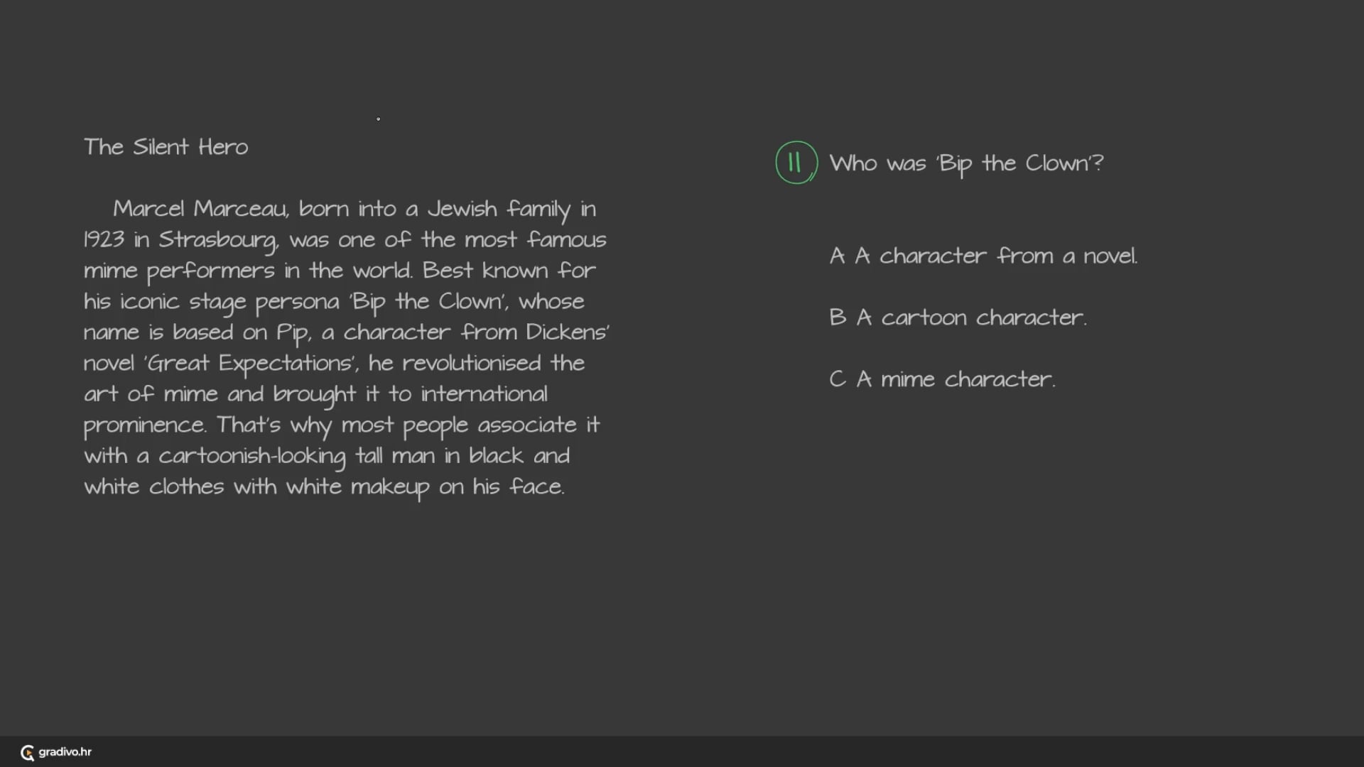 Once he disguised himself as a boy scout leader and took 24 Jewish kids in scout uniforms through the forests to the border. When he unexpectedly ran into a group of German soldiers, he pretended that he was a member of the French Army and convinced all 30 of them to surrender. After the war, the silent hero soon skyrocketed to worldwide fame, thanks to the universality of his expression. As he said – mime, like music, knows neither borders nor nationalities.