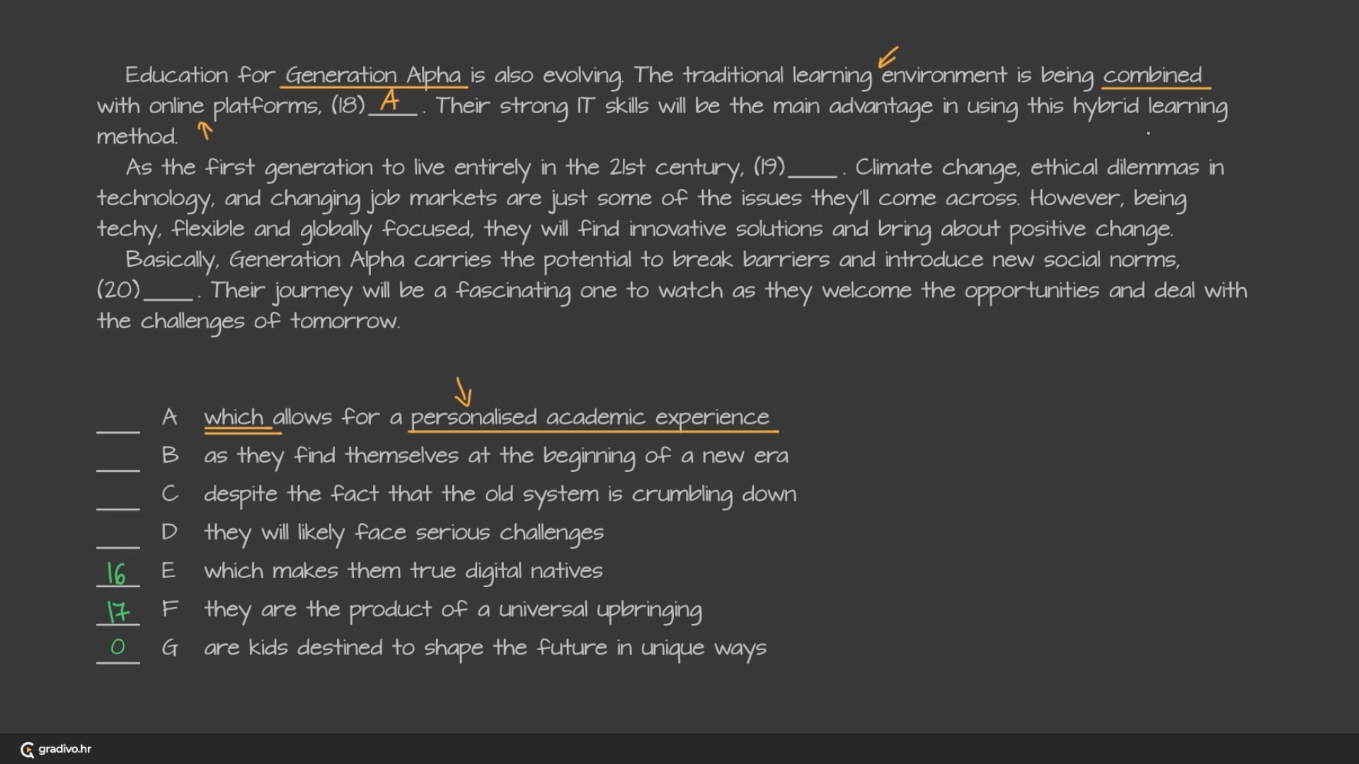Education for Generation Alpha is also evolving. The traditional learning environment is being combined with online platforms, (18)