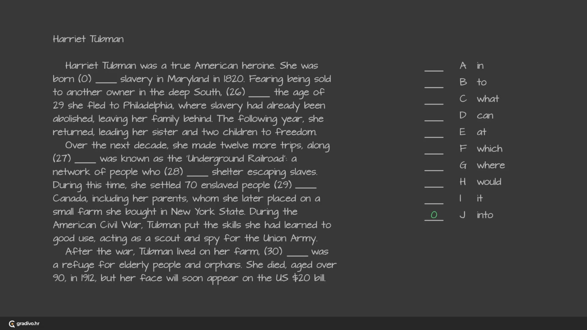 Harriet Tubman was a true American heroine. She was born (0) into slavery in Maryland in 1820.