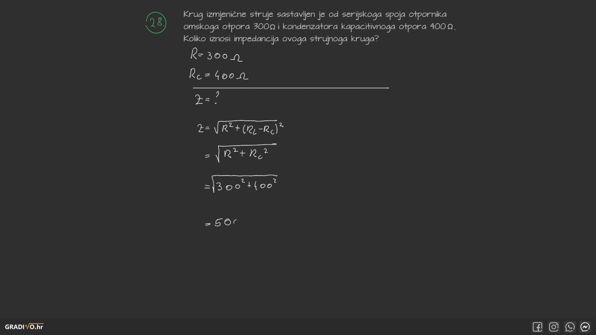 Krug izmjenične struje sastavljen je od serijskoga spoja otpornika omskoga otpora $300 \Omega$ i kondenzatora kapacitivnoga otpora $400 \Omega$. Koliko iznosi impedancija ovoga strujnoga kruga?