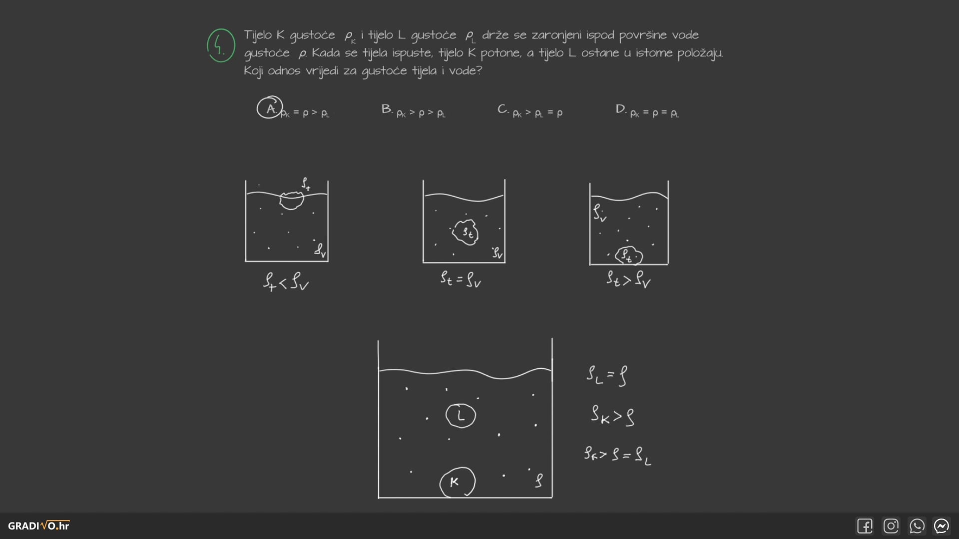 Tijelo K gustoće $\rho_{\mathrm{K}}$ i tijelo L gustoće $\rho_{\mathrm{L}}$ drže se zaronjeni ispod površine vode gustoće $\rho$. Kada se tijela ispuste, tijelo K potone, a tijelo L ostane u istome položaju.Koji odnos vrijedi za gustoće tijela i vode?