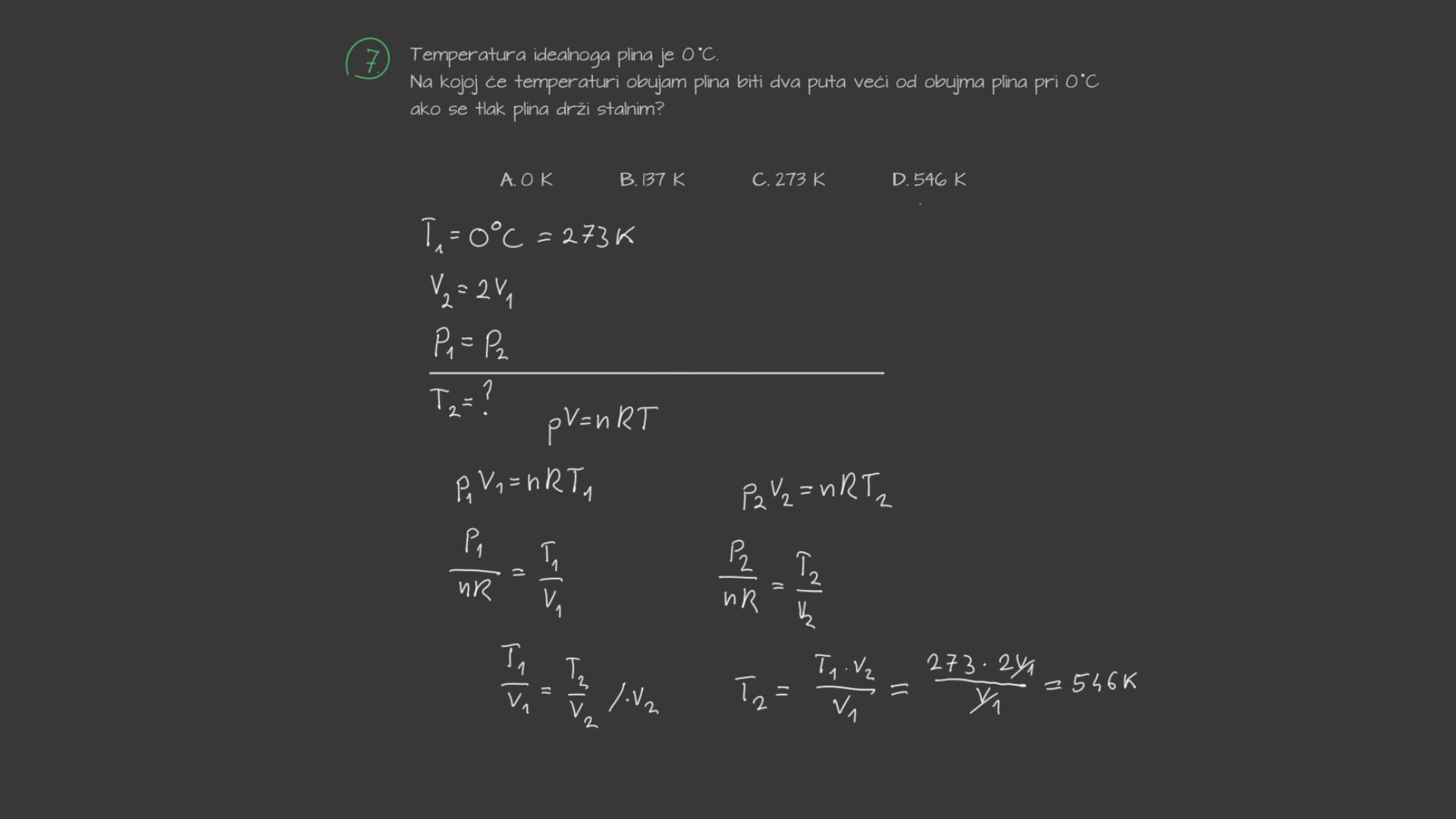 Temperatura idealnoga plina je $0^{\circ} \mathrm{C}$. Na kojoj će temperaturi obujam plina biti dva puta veći od obujma plina pri $0^{\circ} \mathrm{C}$ ako se tlak plina drži stalnim?