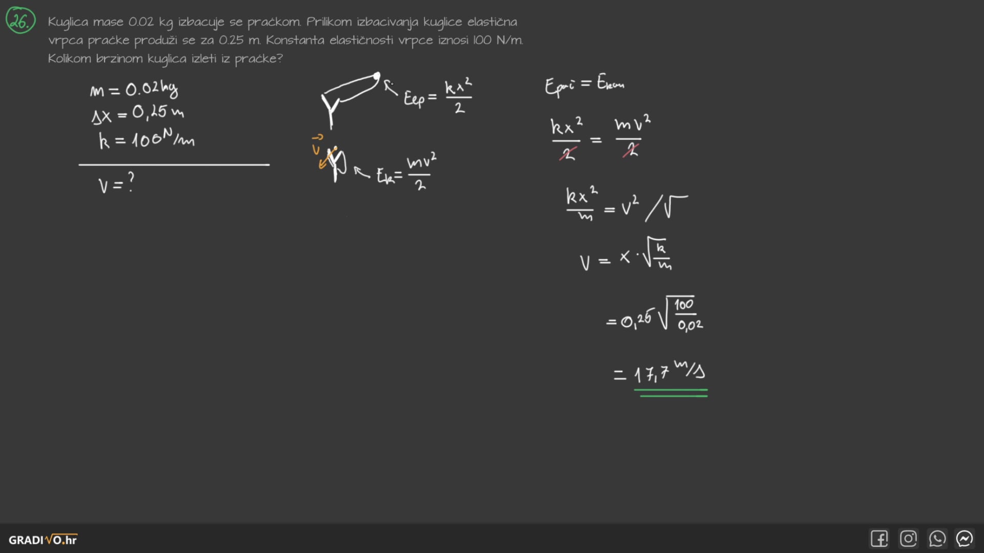 Kuglica mase 0.02 kg izbacuje se praćkom. Prilikom izbacivanja kuglice elastična vrpca praćke produži se za 0.25 m . Konstanta elastičnosti vrpce iznosi 100 N/m. Kolikom brzinom kuglica izleti iz praćke?
