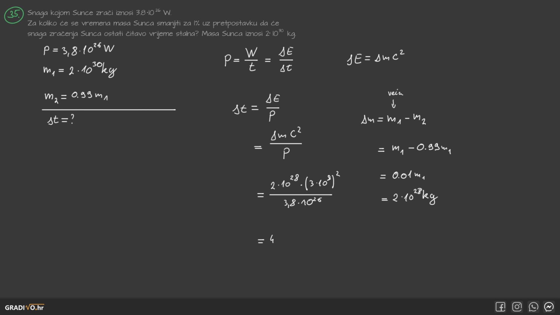 Snaga kojom Sunce zrači iznosi $3.8 \cdot 10^{26} \mathrm{~W}$. Za koliko će se vremena masa Sunca smanjiti za 1% uz pretpostavku da će snaga zračenja Sunca ostati čitavo vrijeme stalna? Masa Sunca iznosi $2 \cdot 10^{30} \mathrm{~kg}$.