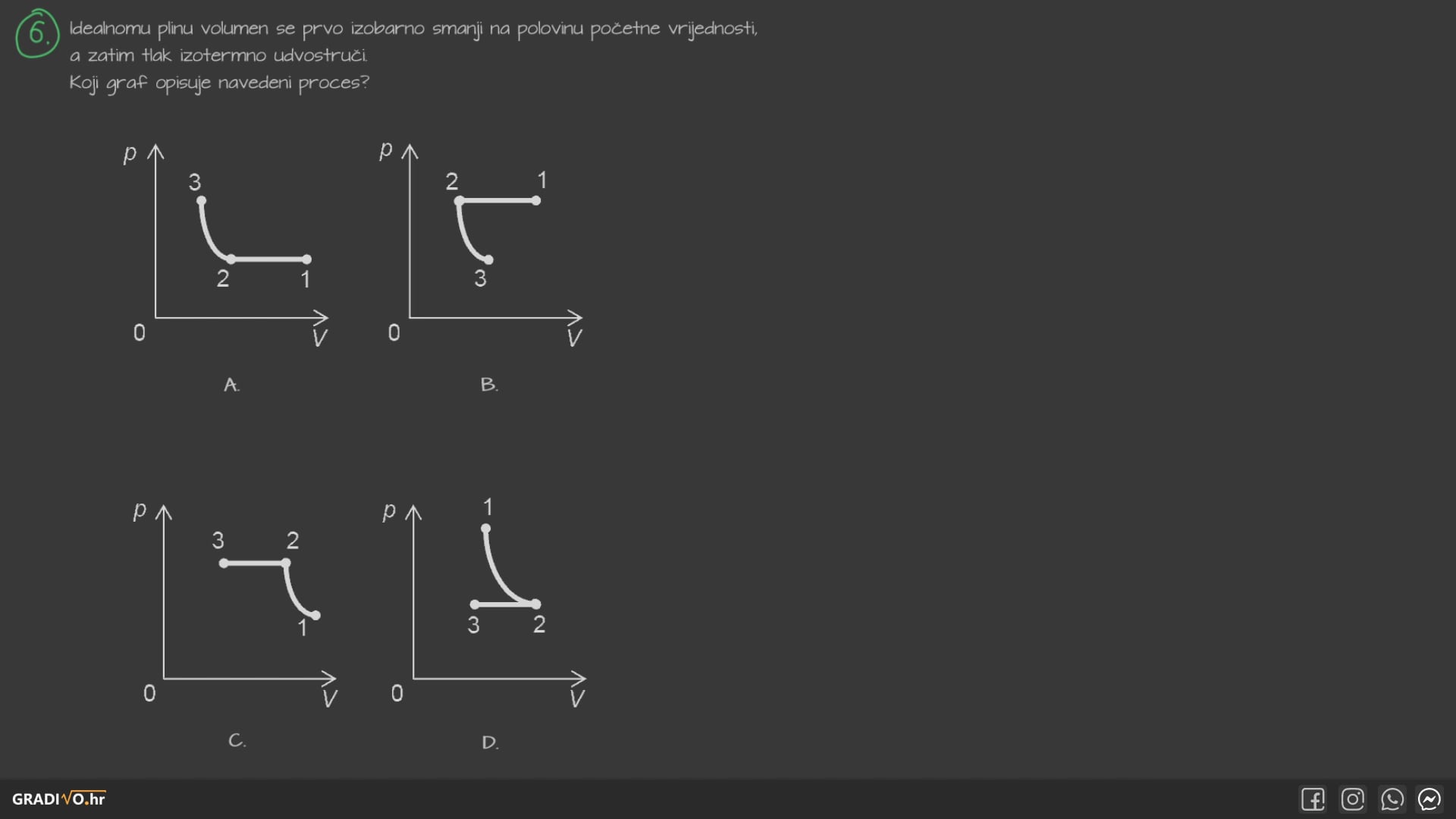 Idealnomu plinu volumen se prvo izobarno smanji na polovinu početne vrijednosti, a zatim tlak izotermno udvostruči.