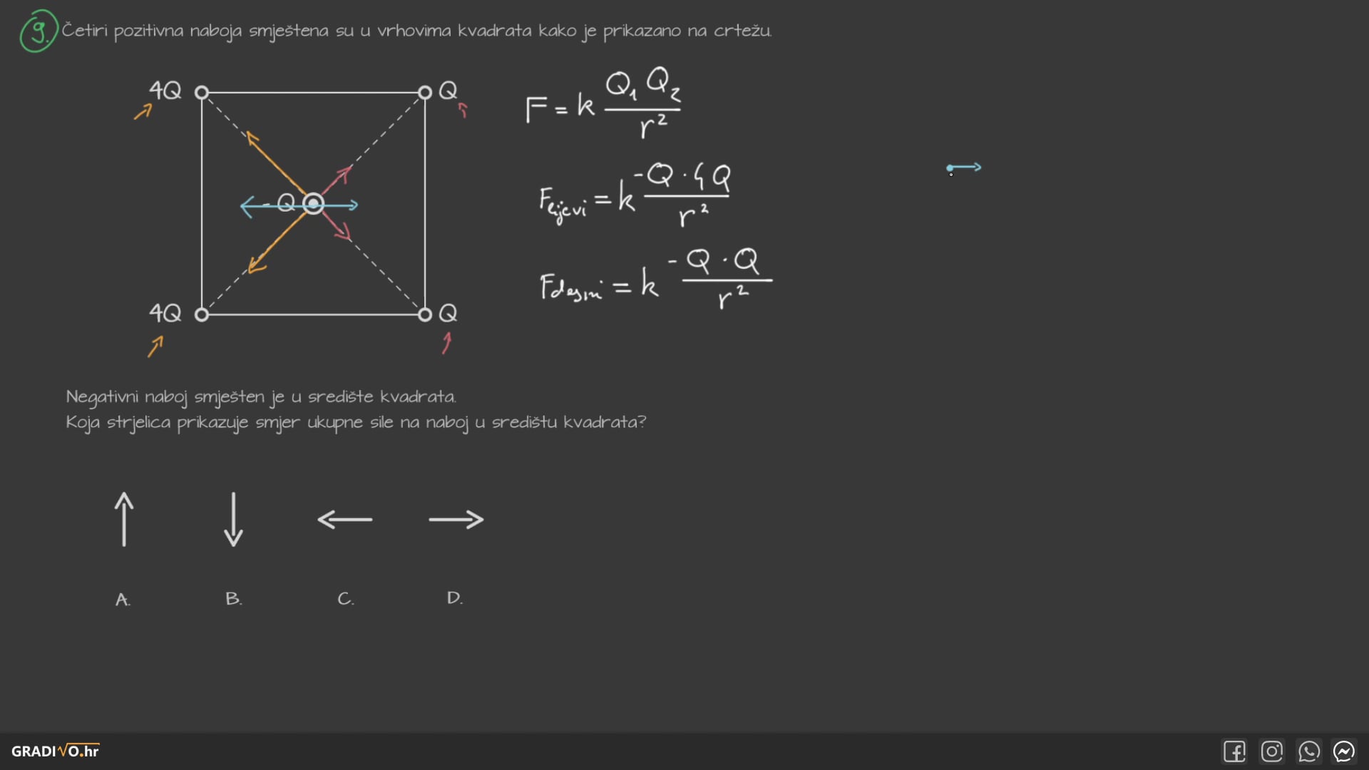 Koja strjelica prikazuje smjer ukupne sile na naboj u središtu kvadrata?