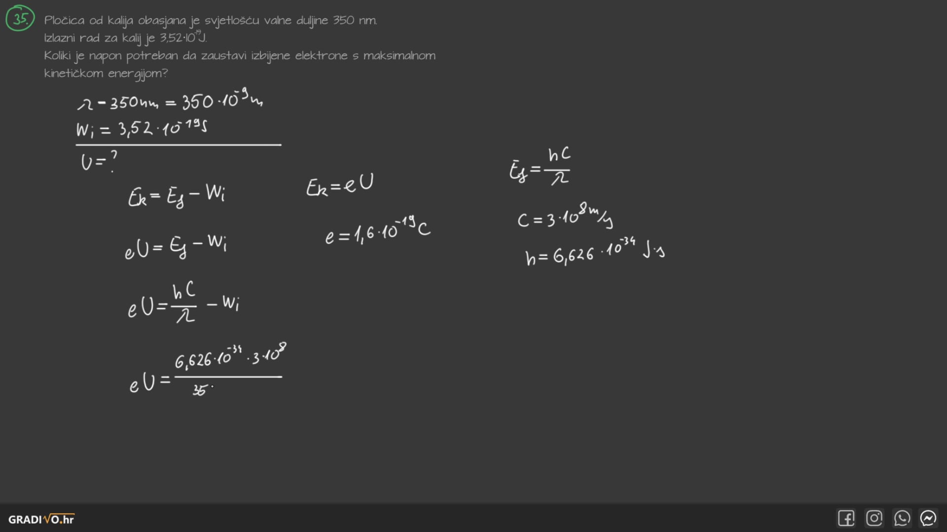 Pločica od kalija obasjana je svjetlošću valne duljine 350 nm . Izlazni rad za kalij je $3,52 \cdot 10^{-19} \mathrm{~J}$. Koliki je napon potreban da zaustavi izbijene elektrone s maksimalnom kinetičkom energijom?