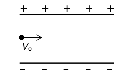 Proton ulazi u prostor između dviju nabijenih ploča, kako je prikazano na crtežu. Električno polje između ploča je homogeno. Početna brzina protona iznosa $v_{0}$ okomita je na električno polje.