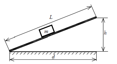 Tijelo mase $m$ postavljeno je na ravnu gredu duljine $L$. Jedan kraj grede podigne se na visinu $h$ od vodoravnoga tla, kao što je prikazano na crtežu. Koliki je iznos ukupne sile na tijelo? Oznakom $d$ na crtežu označena je duljina osnovice kosine koju tvori greda. Zanemarite trenje.