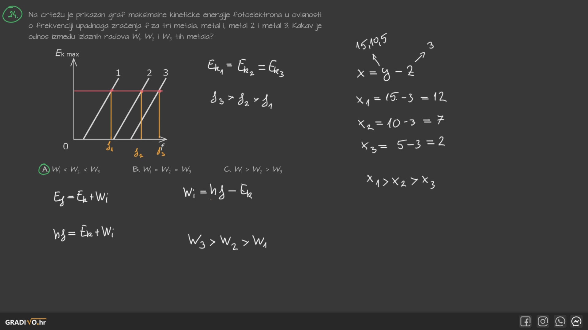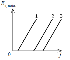 Na crtežu je prikazan graf maksimalne kinetičke energije fotoelektrona u ovisnosti o frekvenciji upadnoga zračenja $f$ za tri metala, metal 1, metal 2 i metal 3. Kakav je odnos između izlaznih radova $W_{1}, W_{2}$ i $W_{3}$ tih metala?