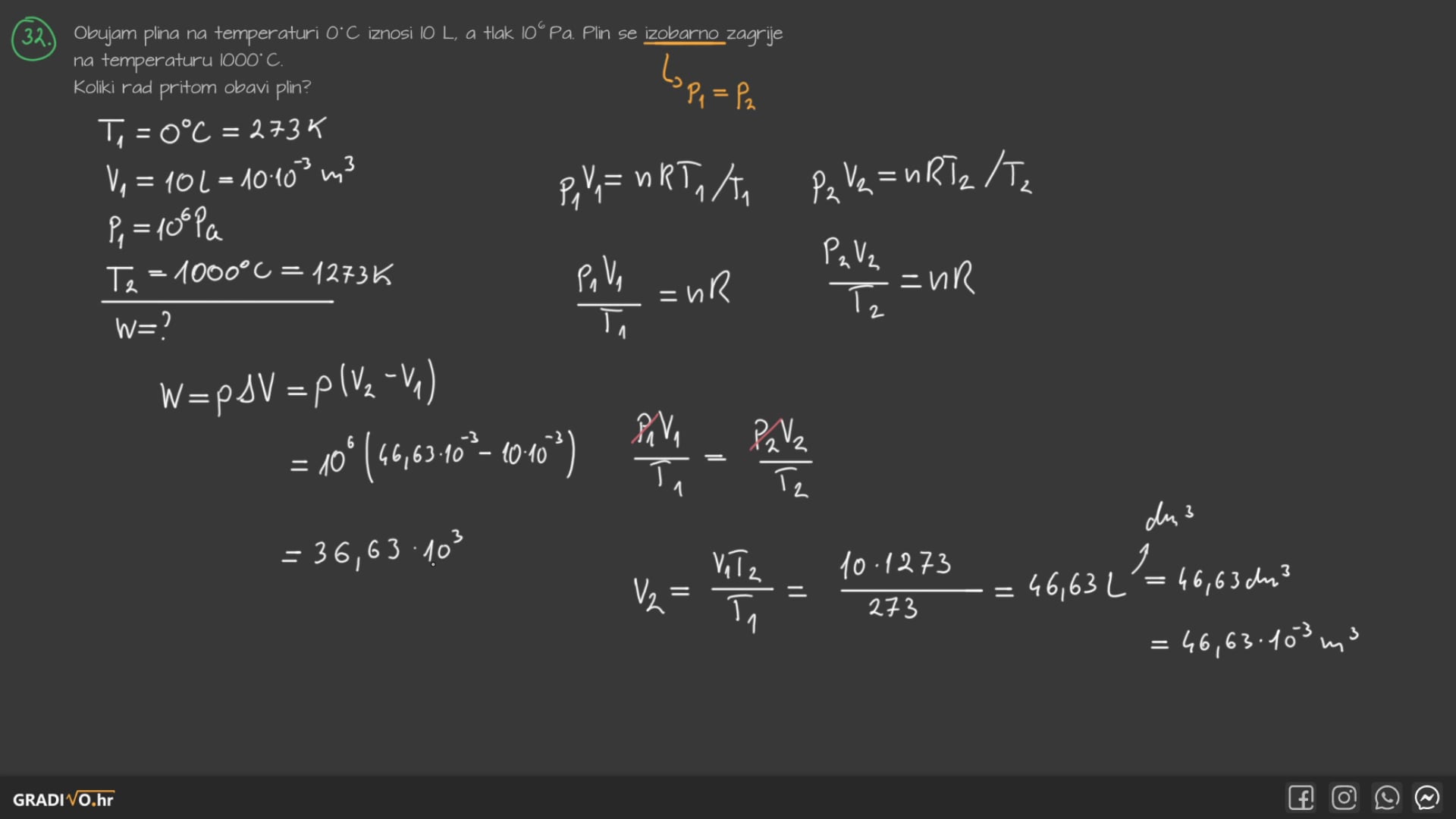 Obujam plina na temperaturi $0{ }^{\circ} \mathrm{C}$ iznosi 10 L , a tlak $10^{6} \mathrm{~Pa}$. Plin se izobarno zagrije na temperaturu $1000^{\circ} \mathrm{C}$.