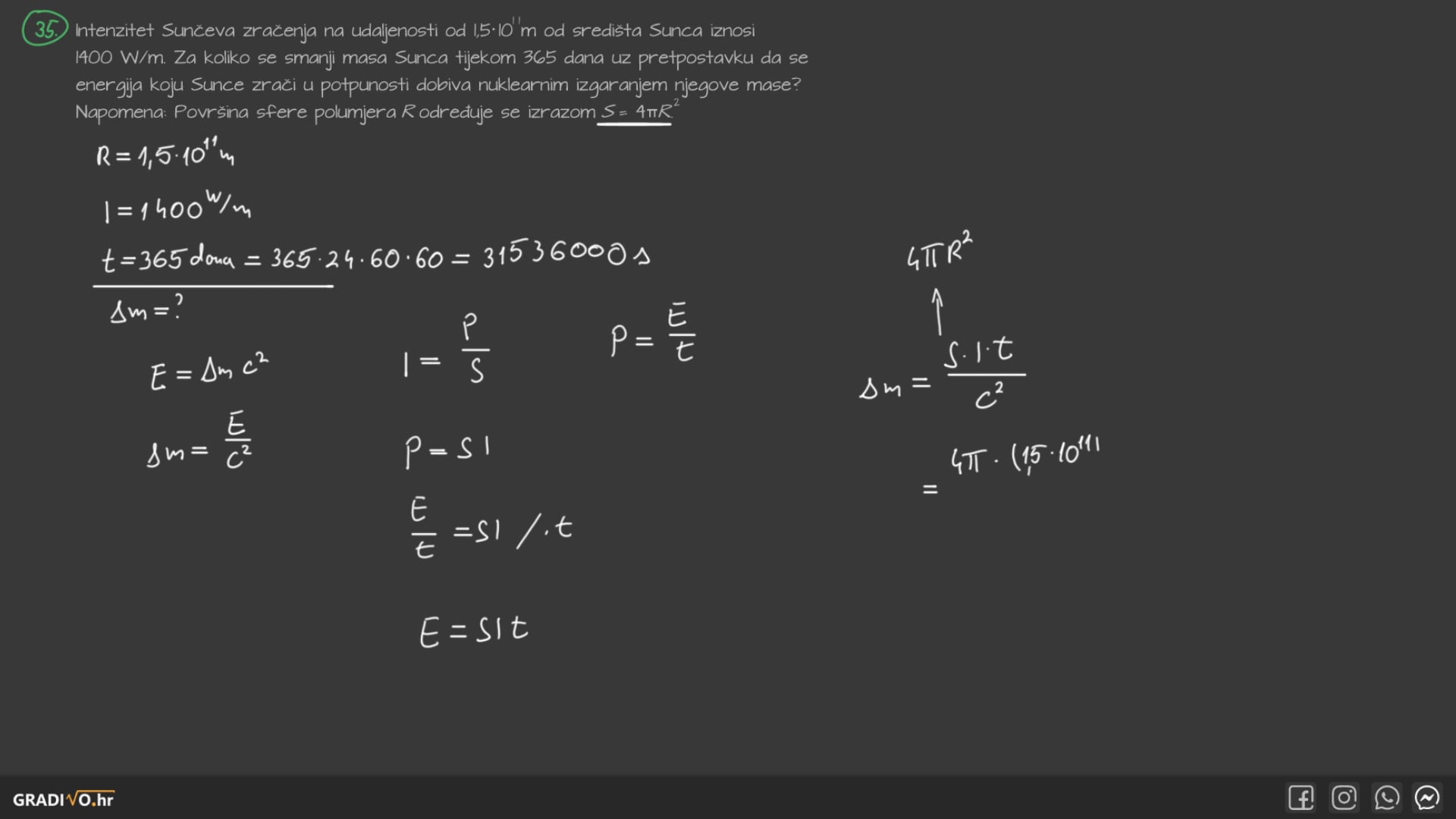 Intenzitet Sunčeva zračenja na udaljenosti od $1,5 \cdot 10^{11} \mathrm{~m}$ od središta Sunca iznosi $1400 \mathrm{~W} / \mathrm{m}^{2}$. Za koliko se smanji masa Sunca tijekom 365 dana uz pretpostavku da se energija koju Sunce zrači u potpunosti dobiva nuklearnim izgaranjem njegove mase? Napomena: Površina sfere polumjera $R$ određuje se izrazom $S=4 \pi R^{2}$.