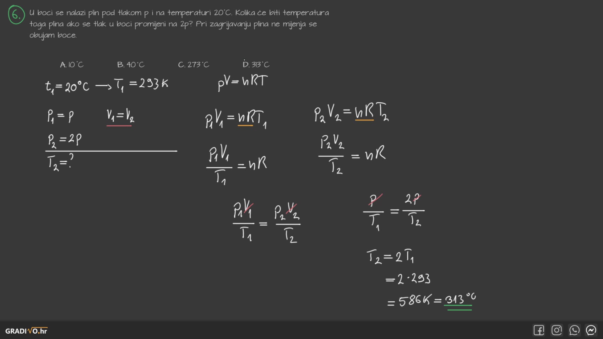 U boci se nalazi plin pod tlakom $p$ i na temperaturi $20^{\circ} \mathrm{C}$. Kolika će biti temperatura toga plina ako se tlak u boci promijeni na $2 p$ ? Pri zagrijavanju plina ne mijenja se obujam boce.