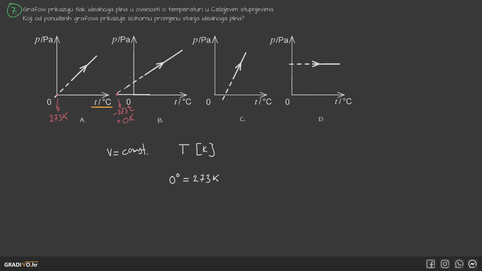 Grafovi prikazuju tlak idealnoga plina u ovisnosti o temperaturi u Celzijevim stupnjevima.Koji od ponuđenih grafova prikazuje izohornu promjenu stanja idealnoga plina?